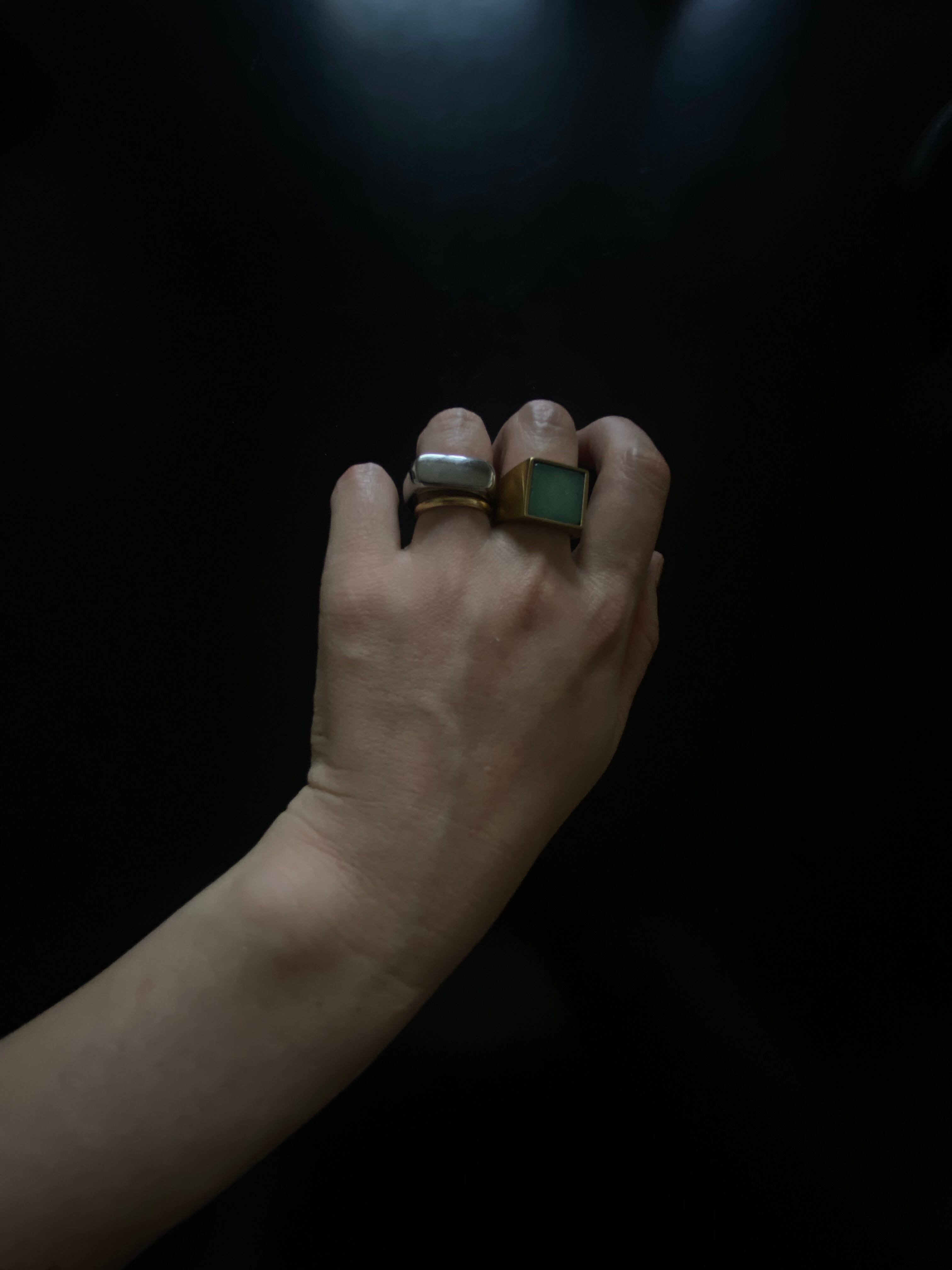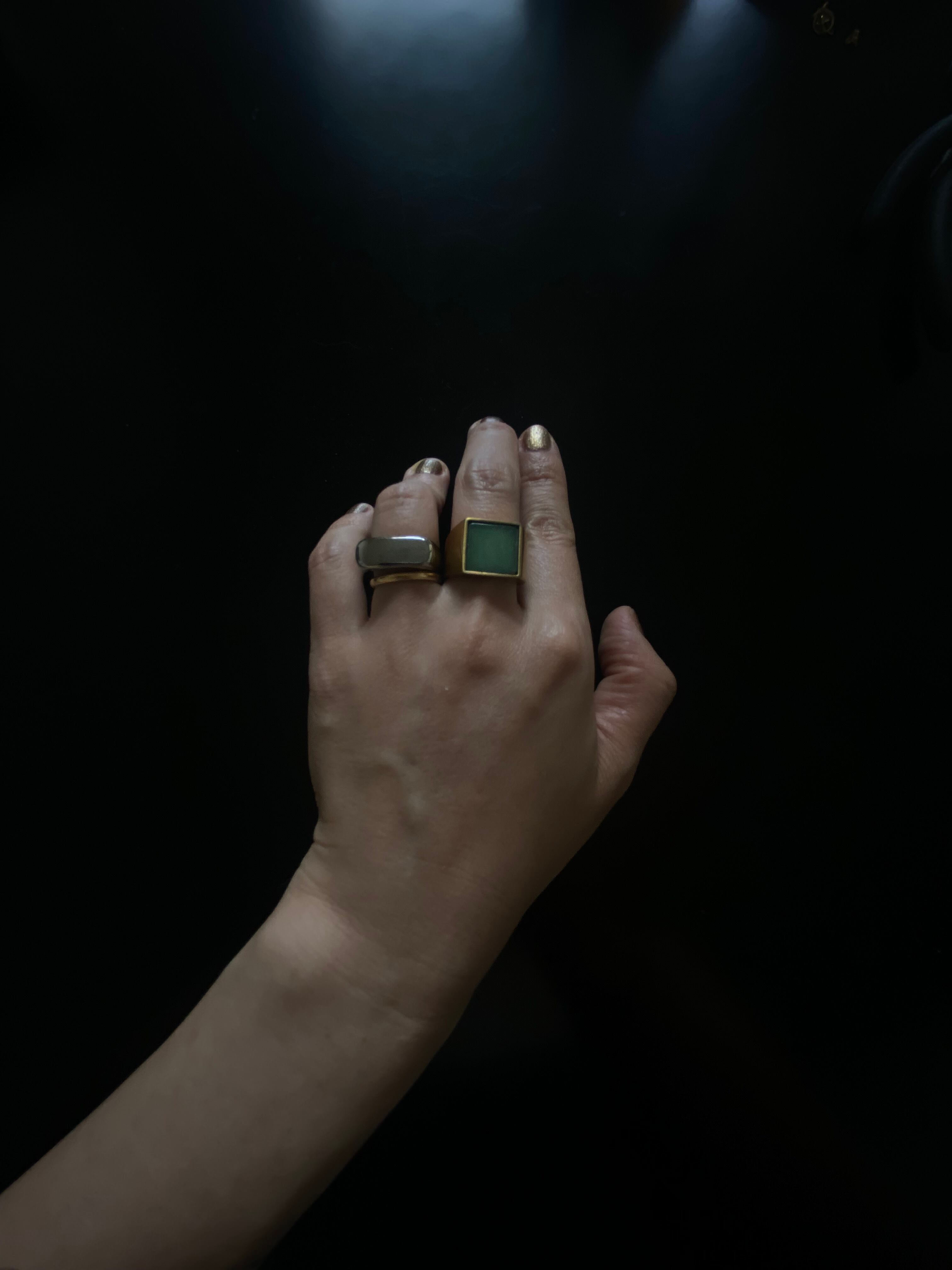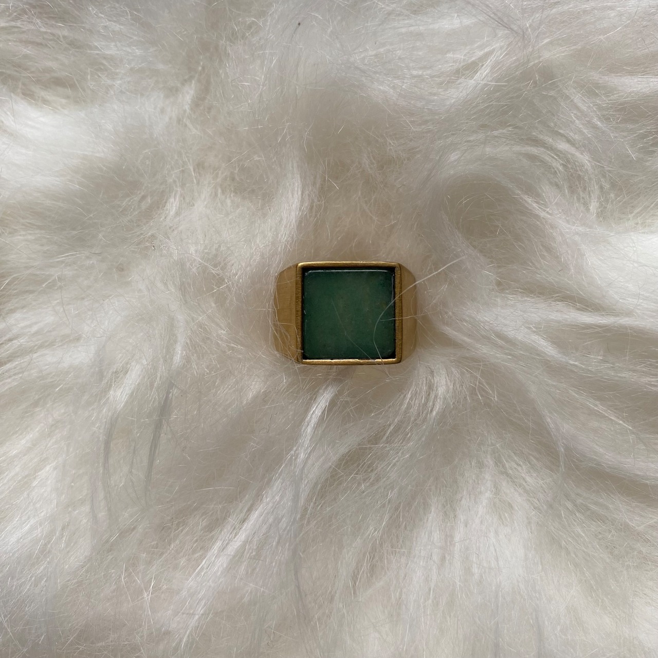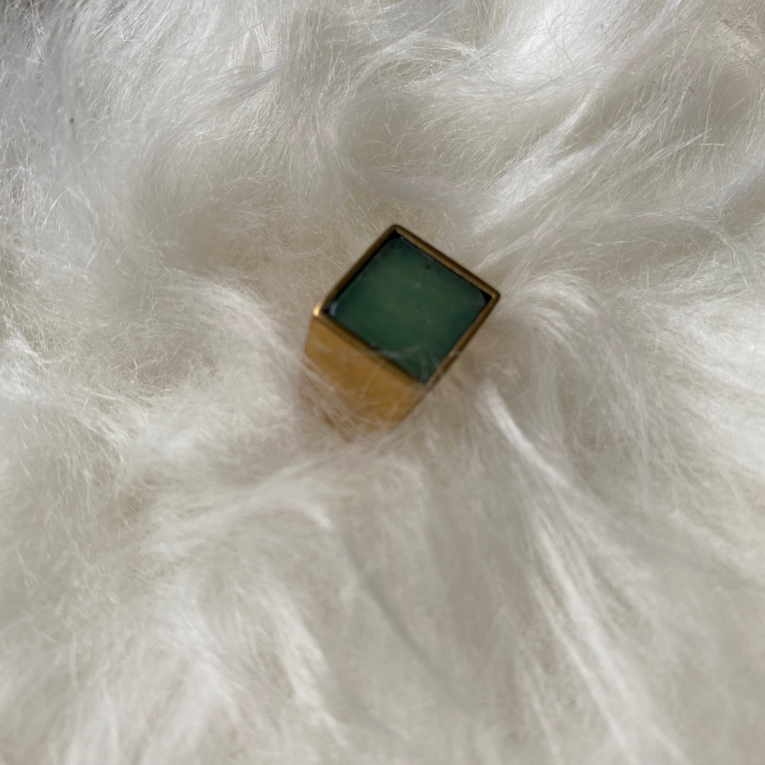 ミントグリーンのストーンのようなモチーフリング。goldに敢えて艶消しを施しています。