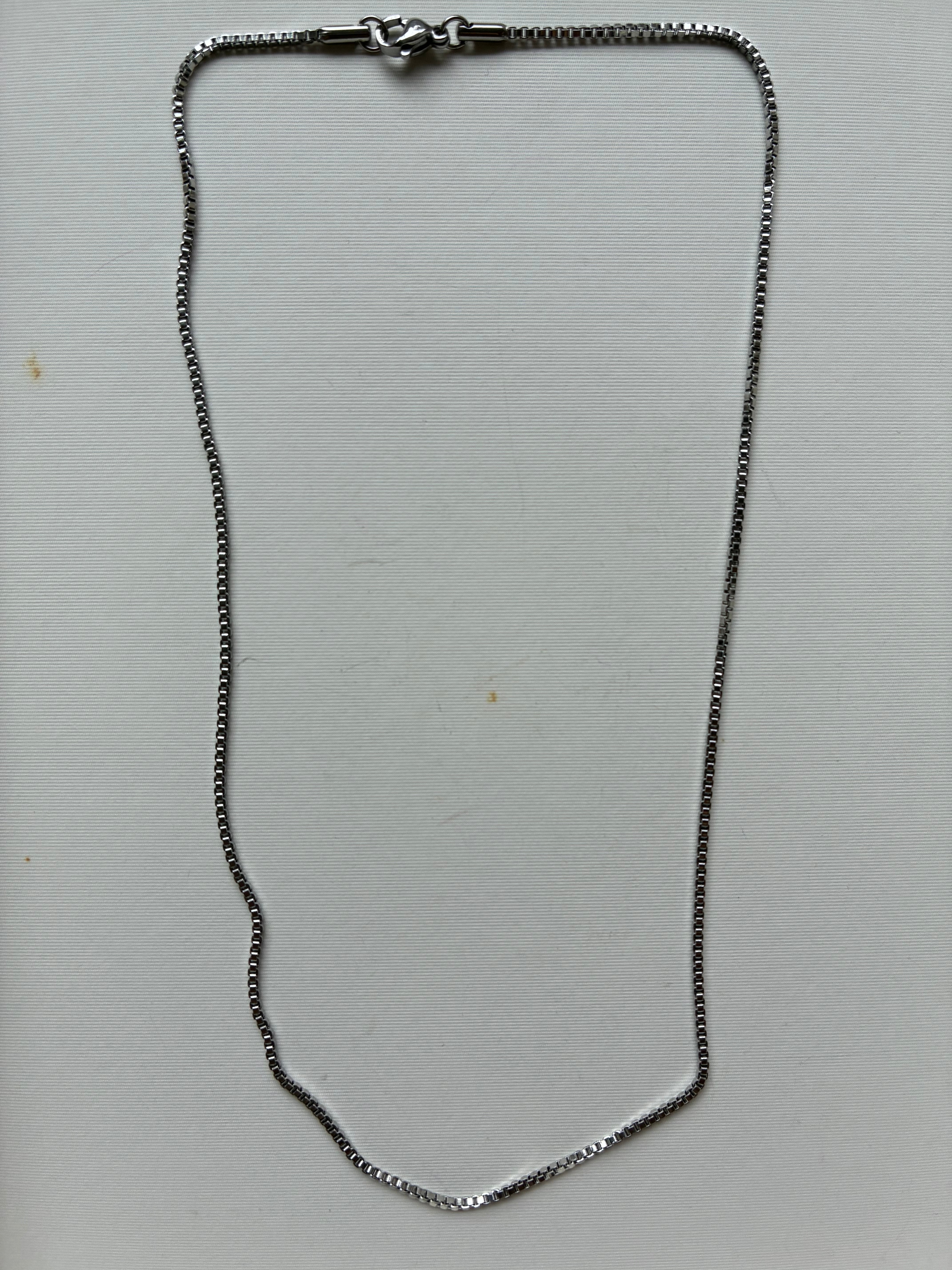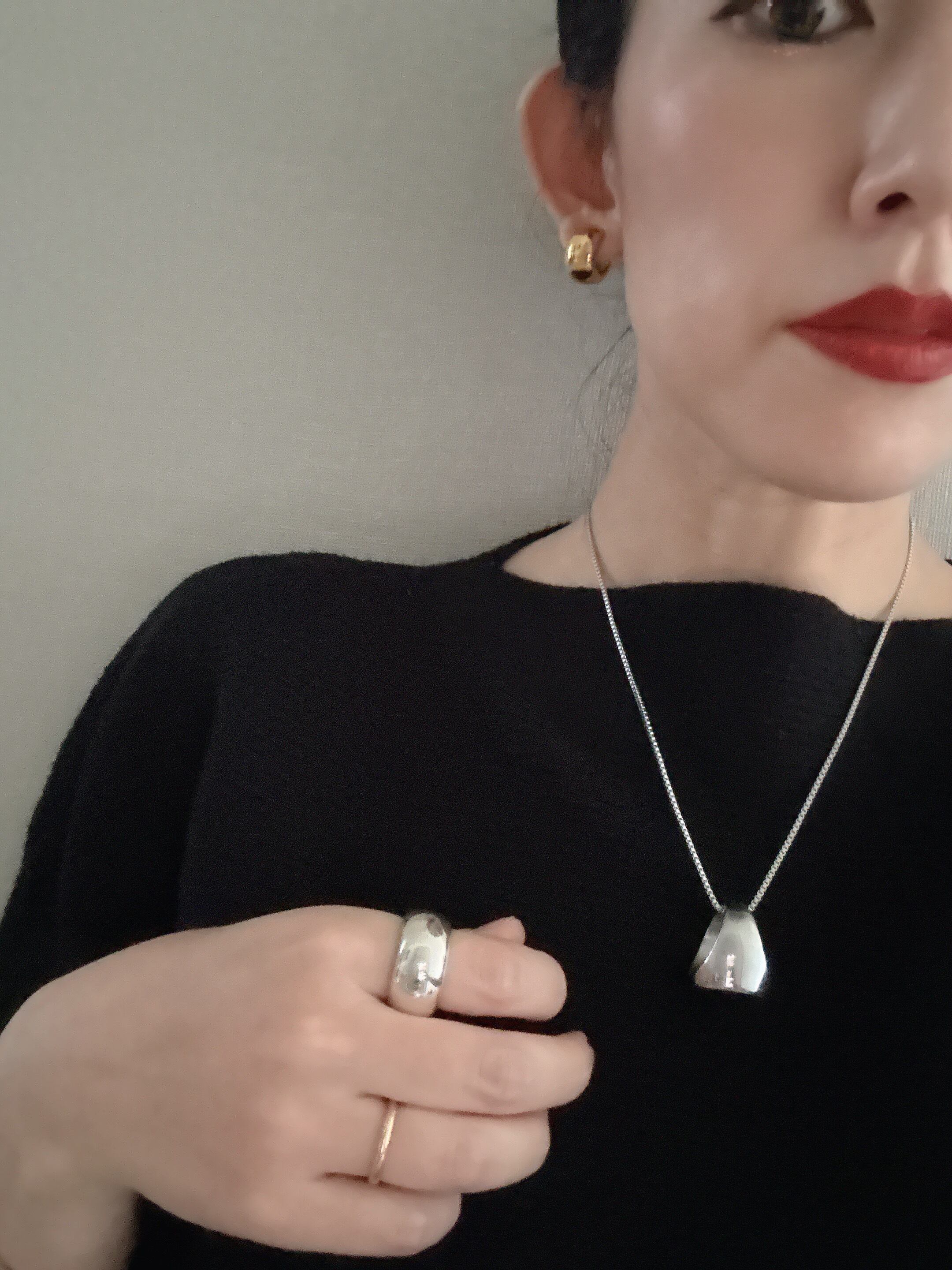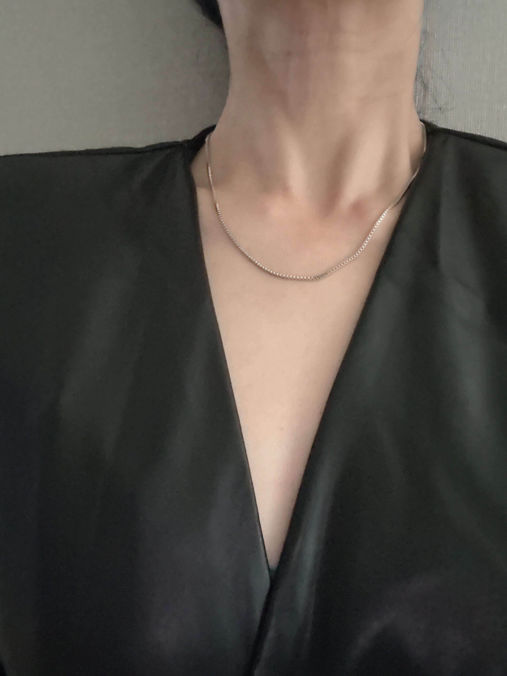 長さ約45㎝。シルバーからーでボリュームのある珍しいベネチアチェーンネックレス。シンプルながらも、鎖骨にあたり動きがあり存在感のあるアイテム。首元がより大人っぽい雰囲気になります。また、重ね付けもシックです。リングを通してアレンジも。