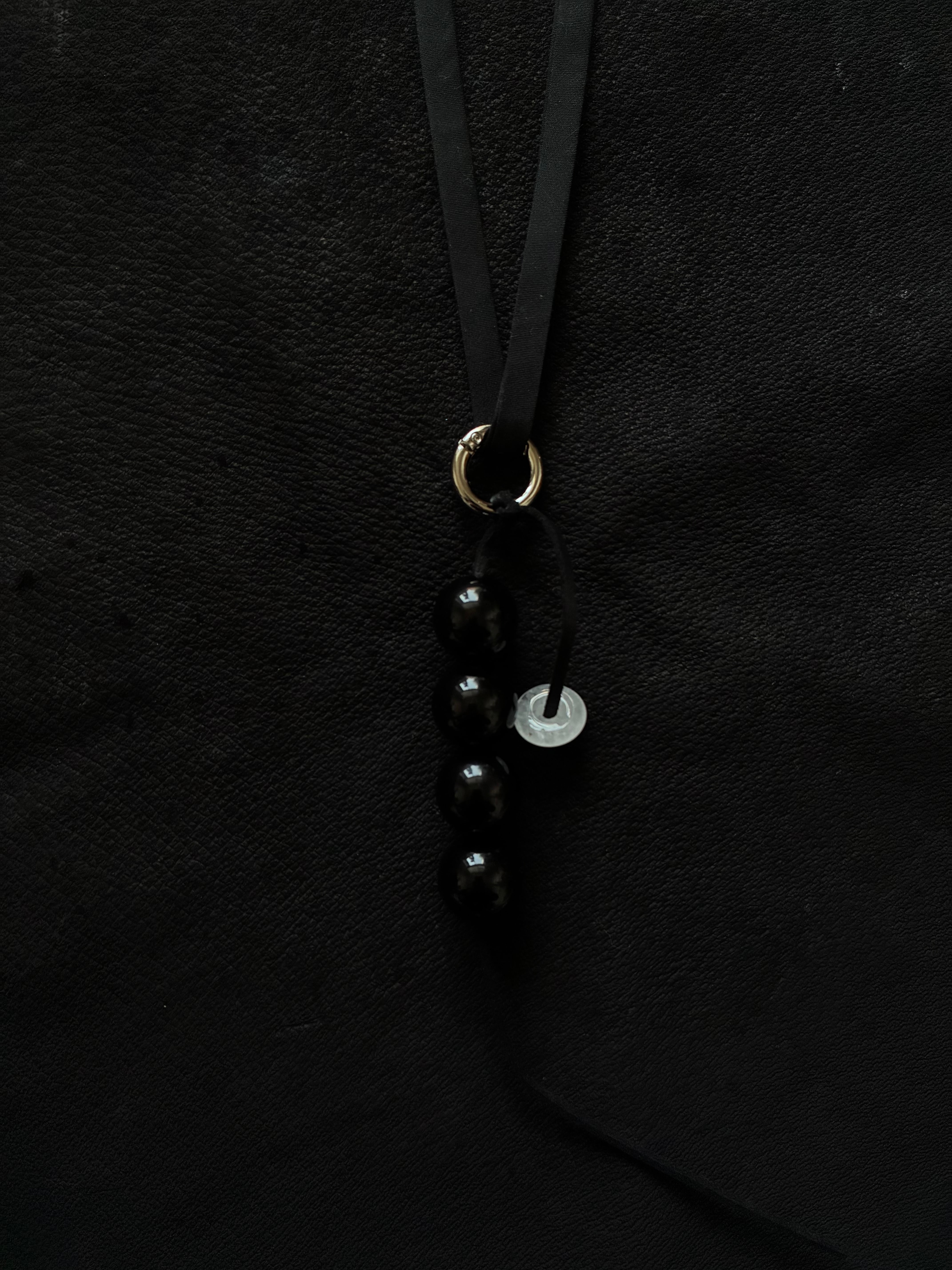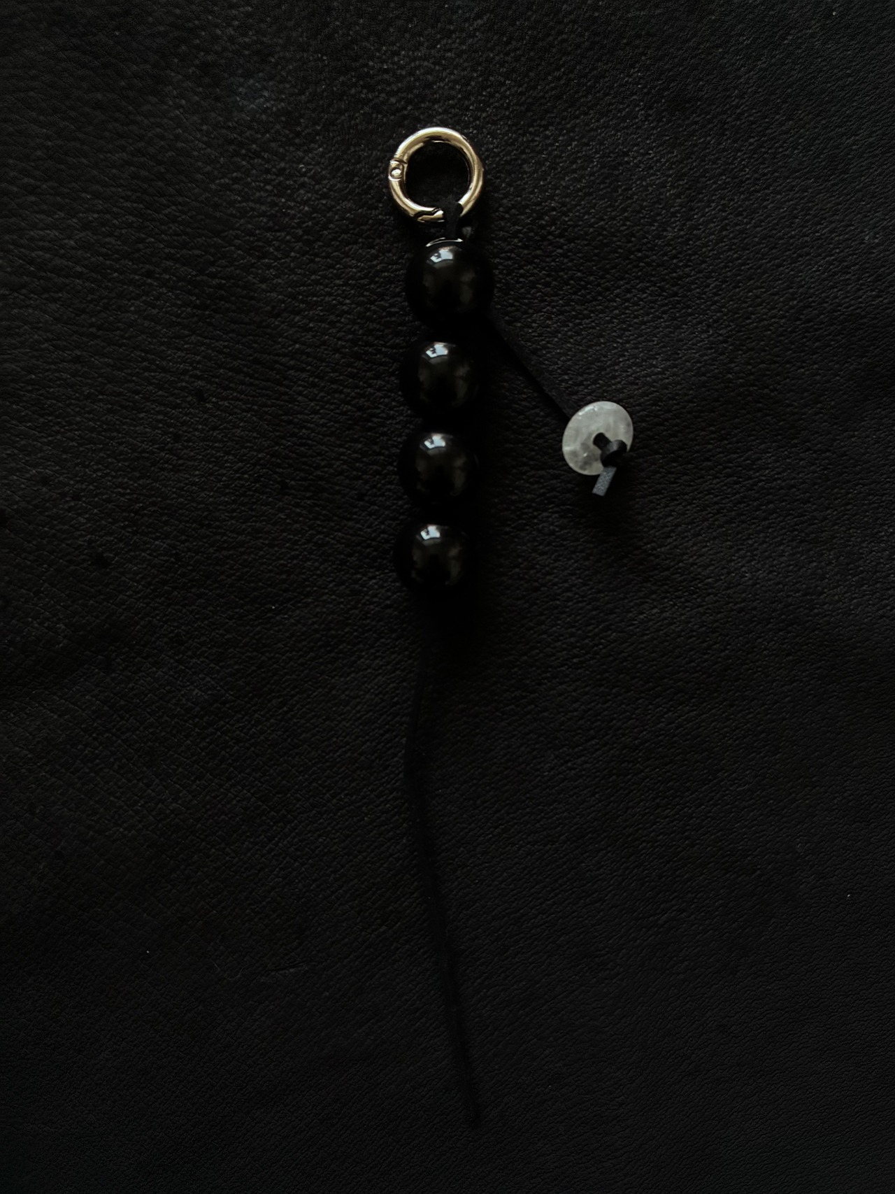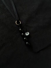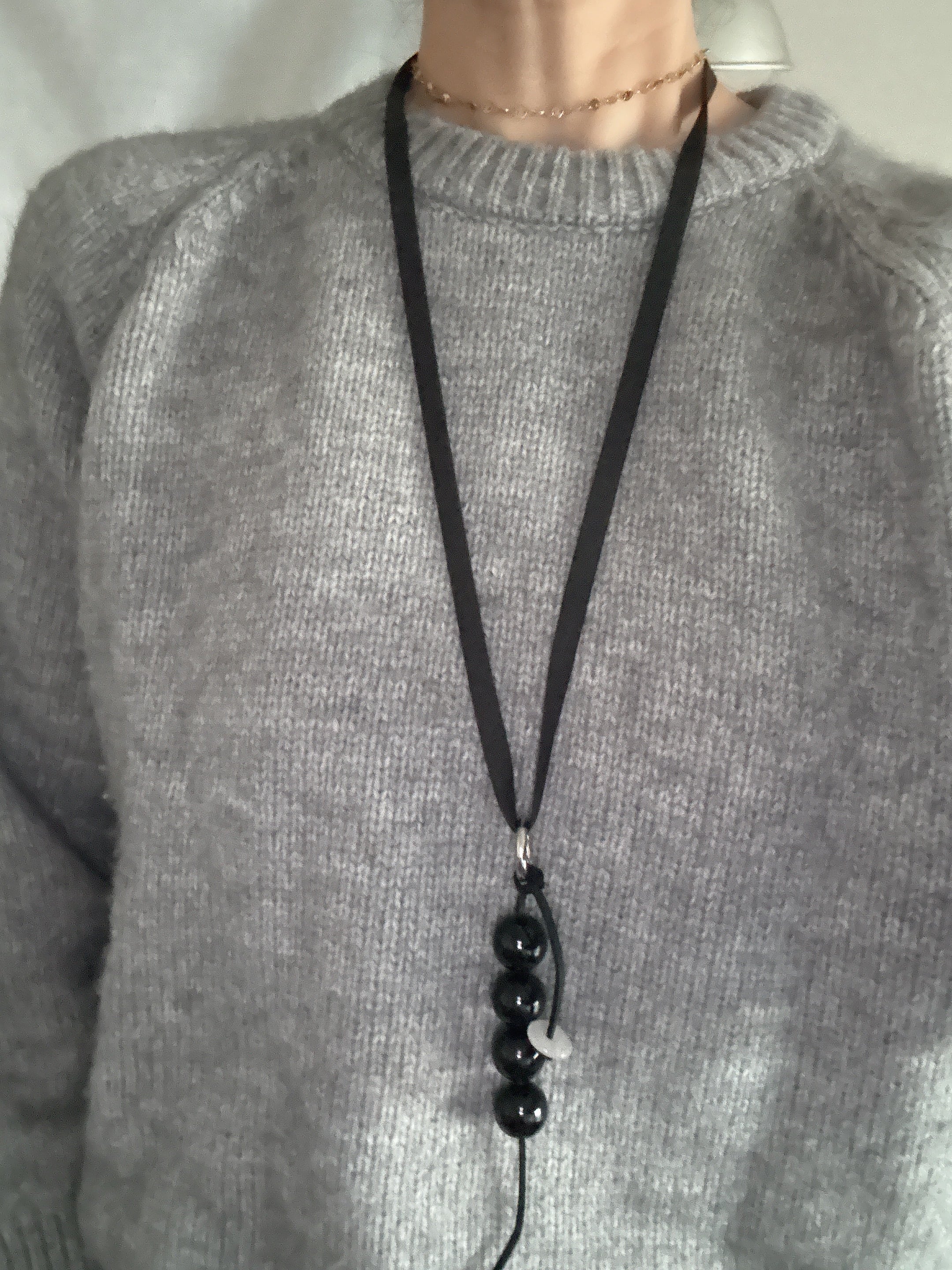 最大長さ約50㎝。結ぶだけなので長さの変更は自由。キーチェーン部分約11㎝。ラフなロングネックレスがイメージソース。連なるボールにクリアホワイトのストーンがマッチする、キーチェーンにもなるアイテム。ネックレス以外では、ベルトループに付けたり、キーホルダーにしたりと色々アレンジを楽しめます。