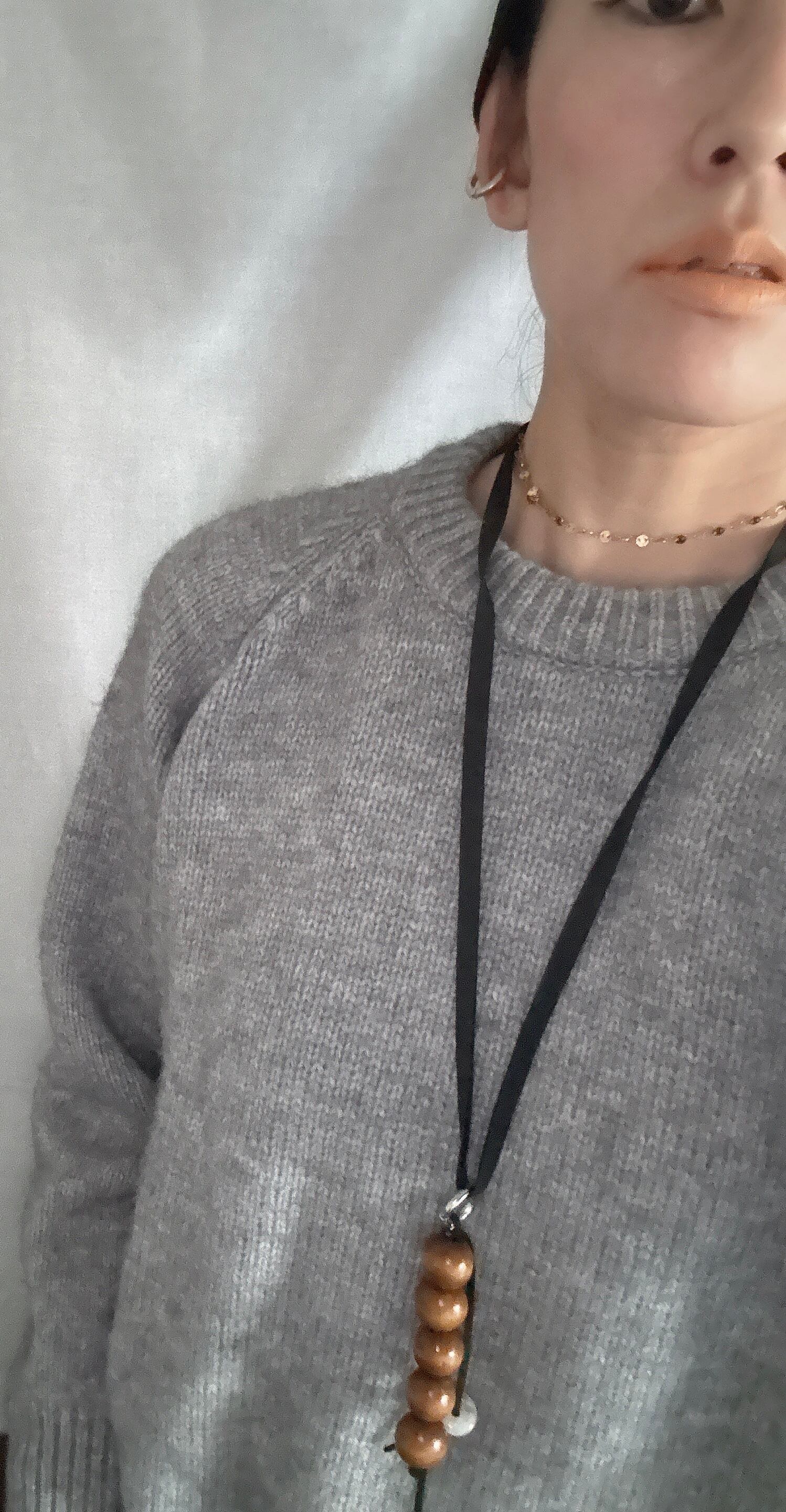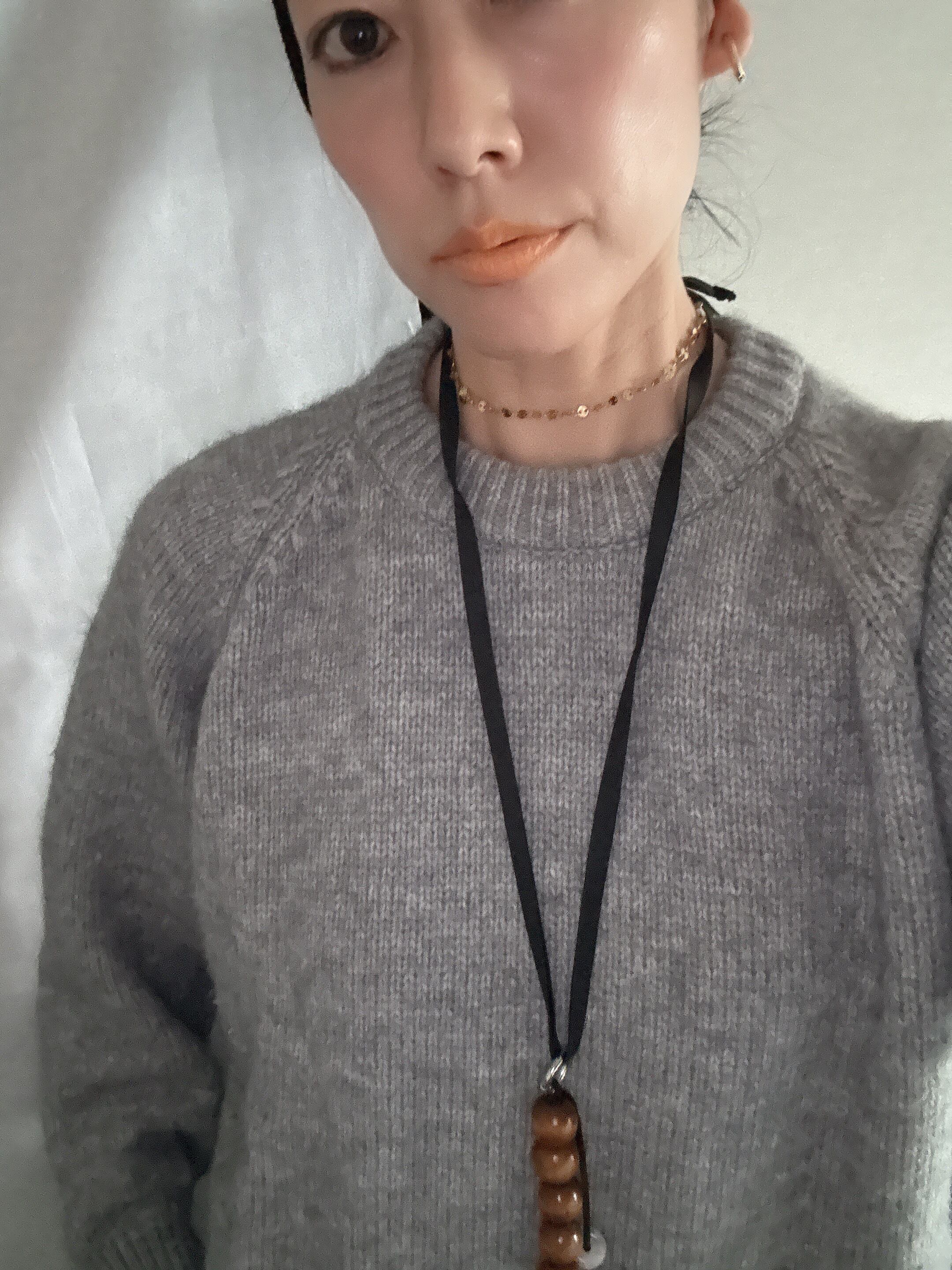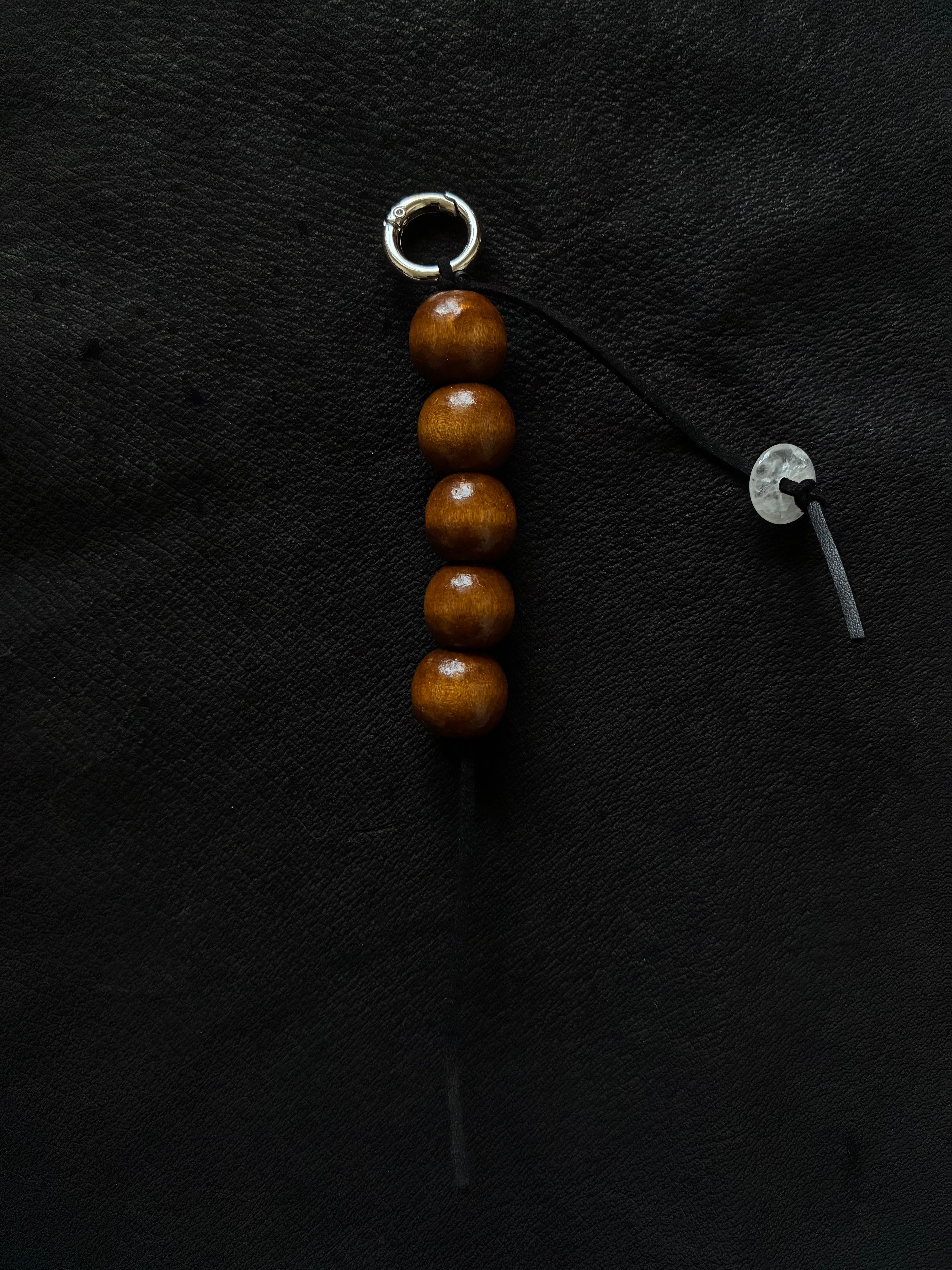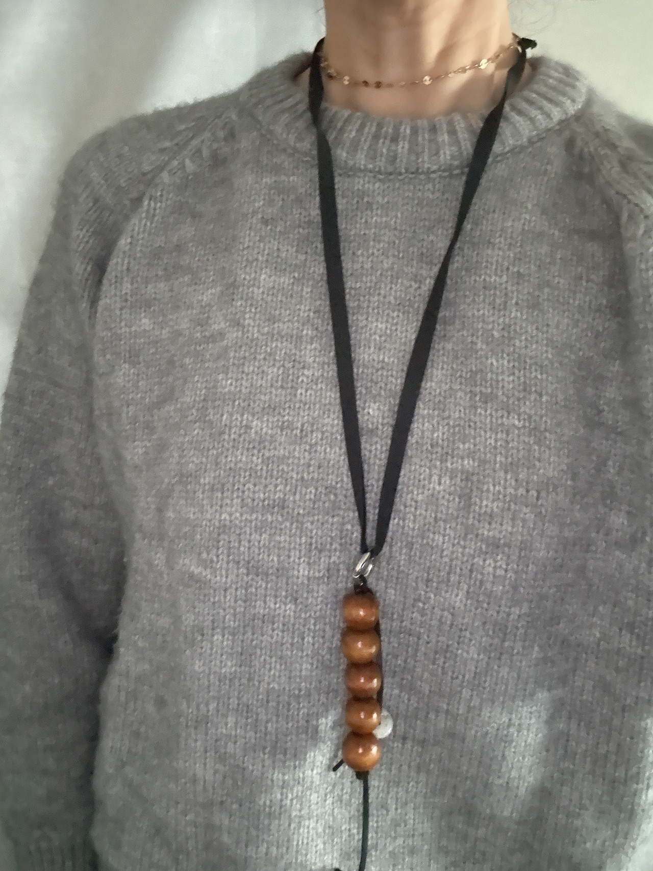 最大長さ約50㎝。結ぶだけなので長さの変更は自由。キーチェーン部分約11㎝。ラフなロングネックレスがイメージソース。連なるボールにクリアホワイトのストーンがマッチする、キーチェーンにもなるアイテム。ネックレス以外では、ベルトループに付けたり、キーホルダーにしたりと色々アレンジを楽しめます。