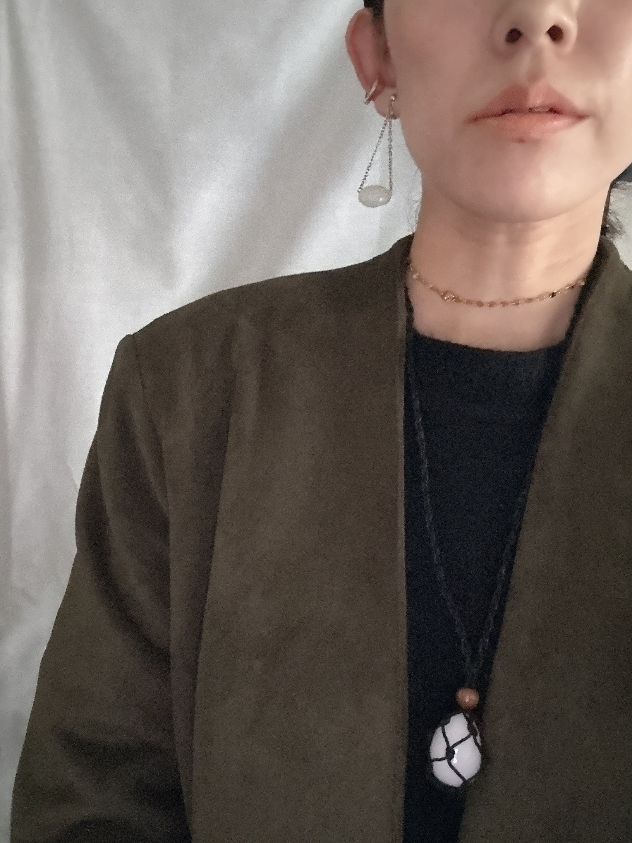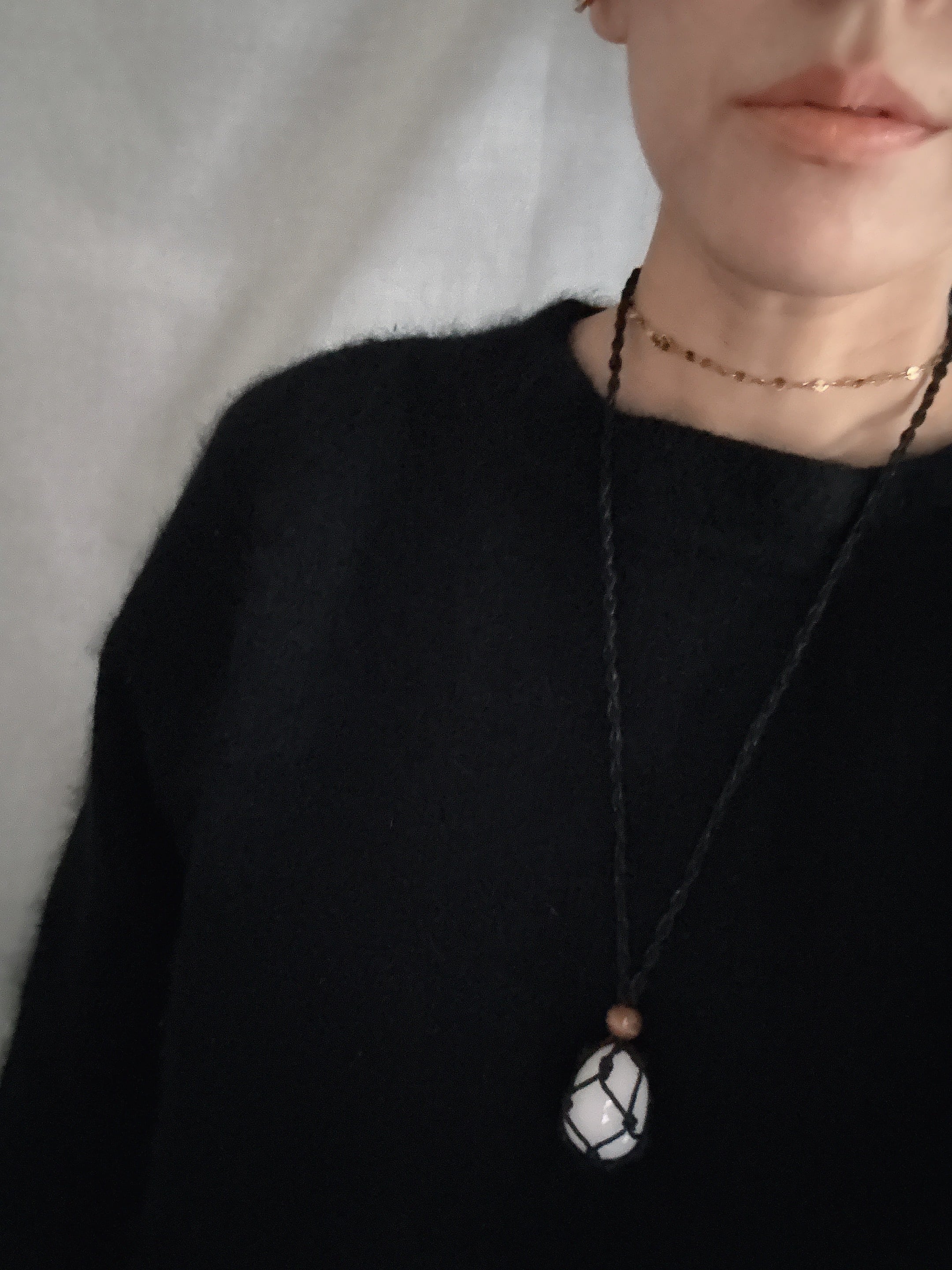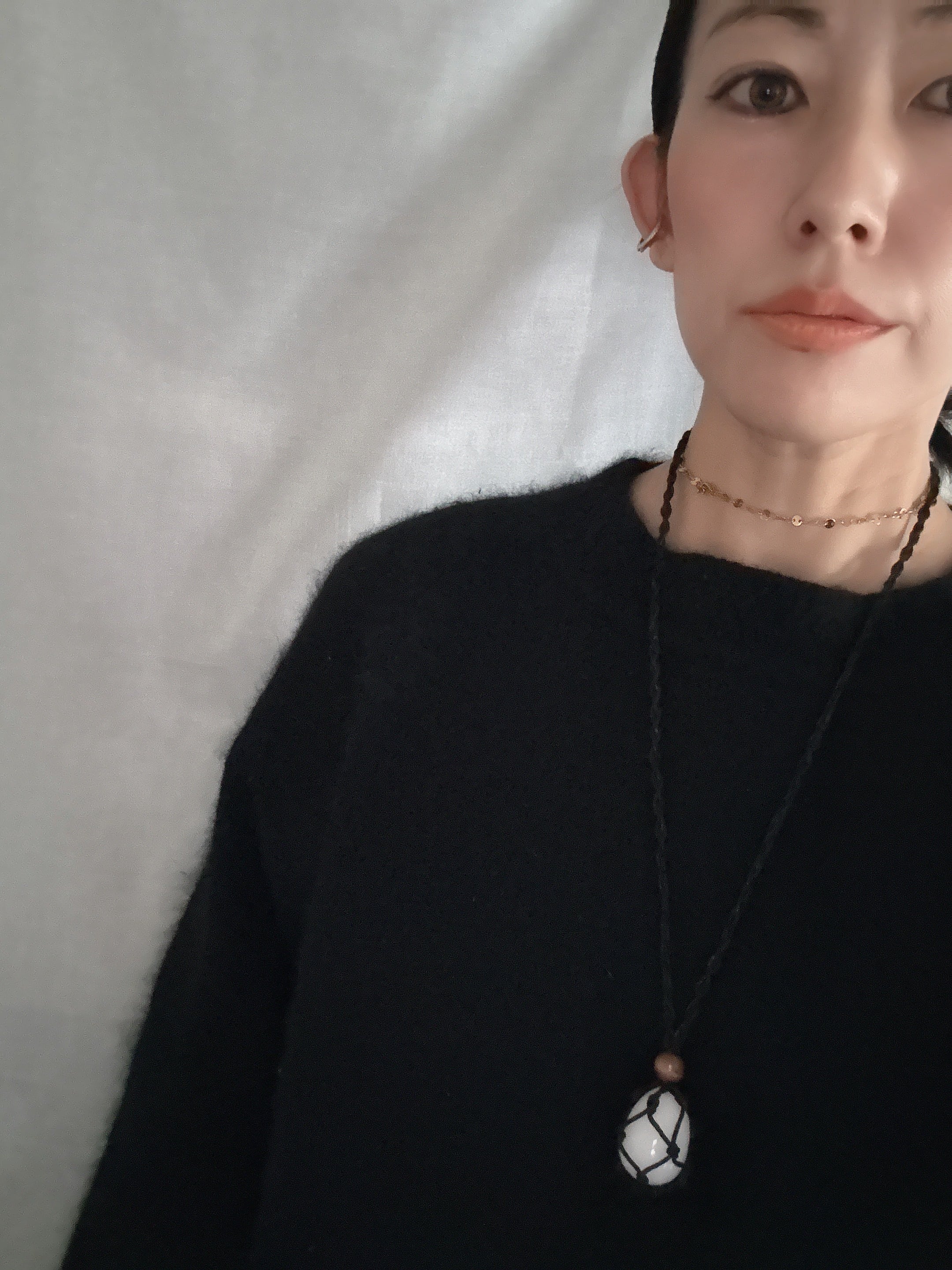 最大長さ約90㎝。アジャスターで長さの変更は自由。ストーン部分約3㎝。ラフなロングネックレスがイメージソース。冬は、やはりロングネックレスが気分。ホワイトストーンを贅沢に使用したネックレス。コーディネートのバランスで長さも変更可能で、一つでオシャレな雰囲気に。
