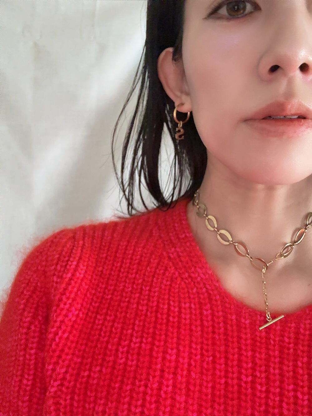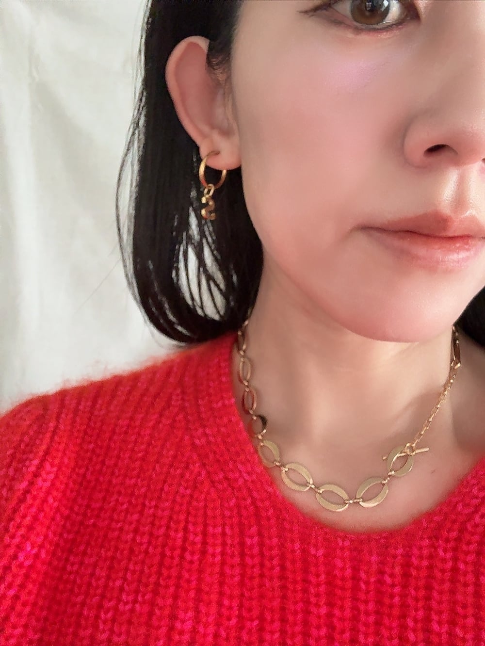 長さ約42㎝。ゴールド。長さは好きな長さに短くアレンジできます。チェーンは2種で、見せ方でも楽しんで頂けます。フラットな珍しい形のチェーンは、それだけで、首元を素敵に演出。