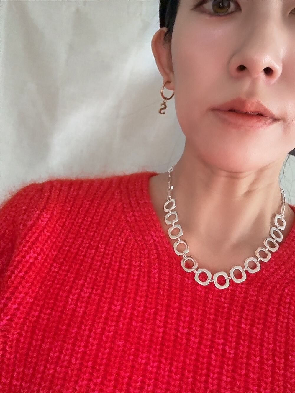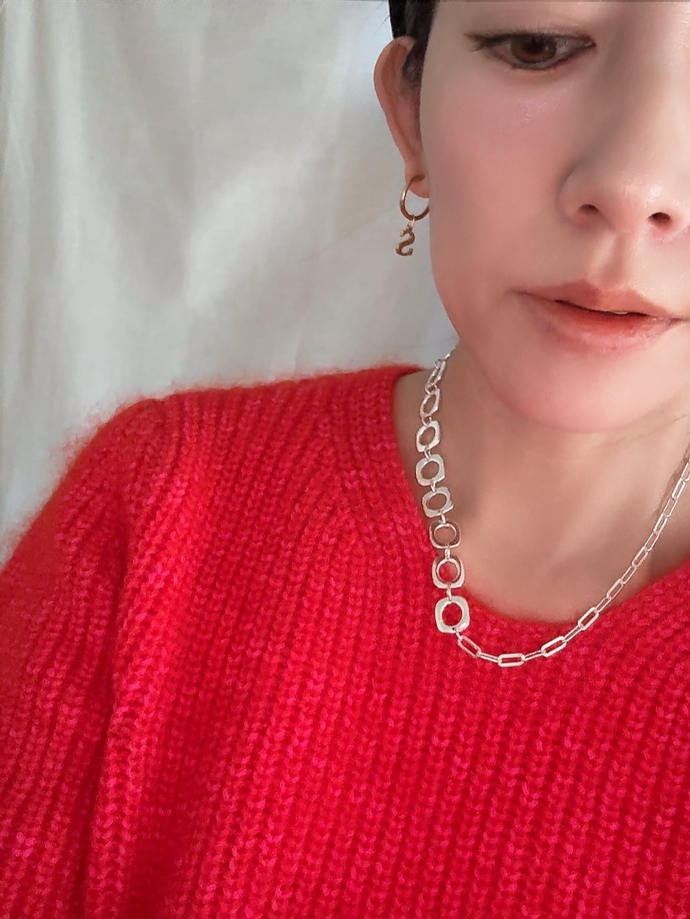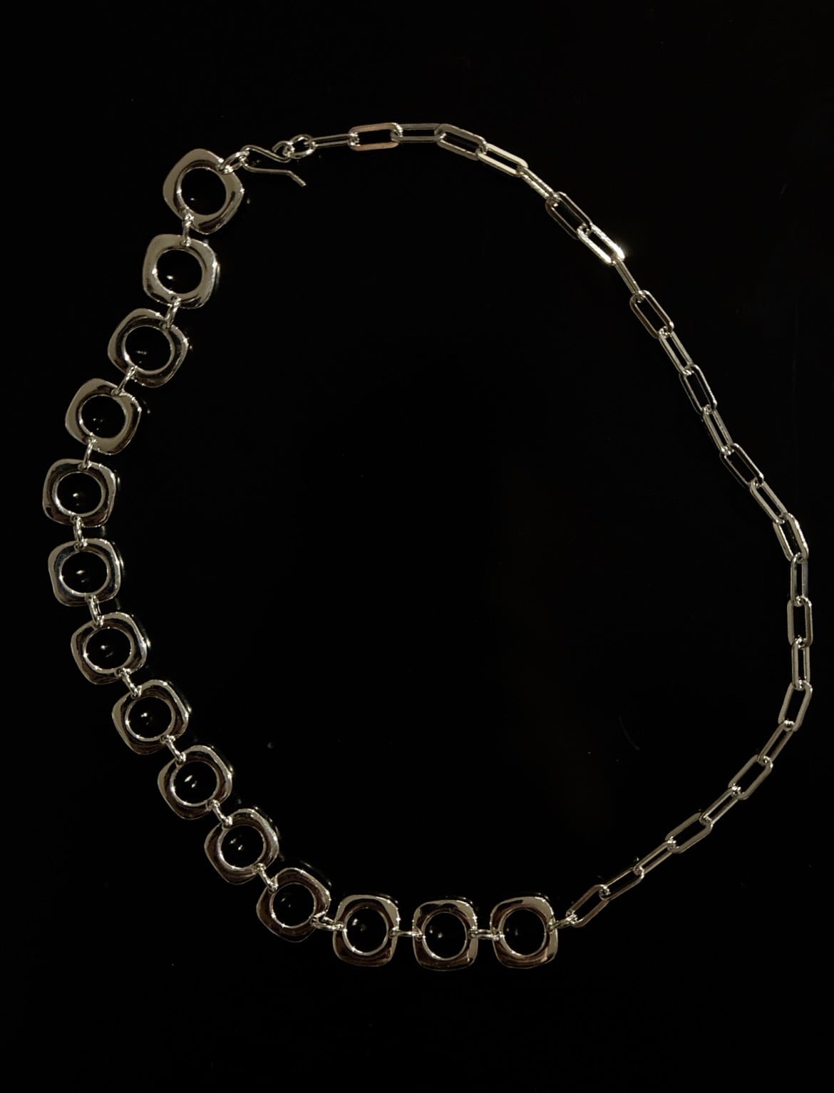 長さ約42㎝。silver925。長さは好きな長さに短くアレンジできます。チェーンは2種で、見せ方でも楽しんで頂けます。また、付属で取り外し可能なボールつき。四角が珍しい形のチェーンのデザインにこだわりました。