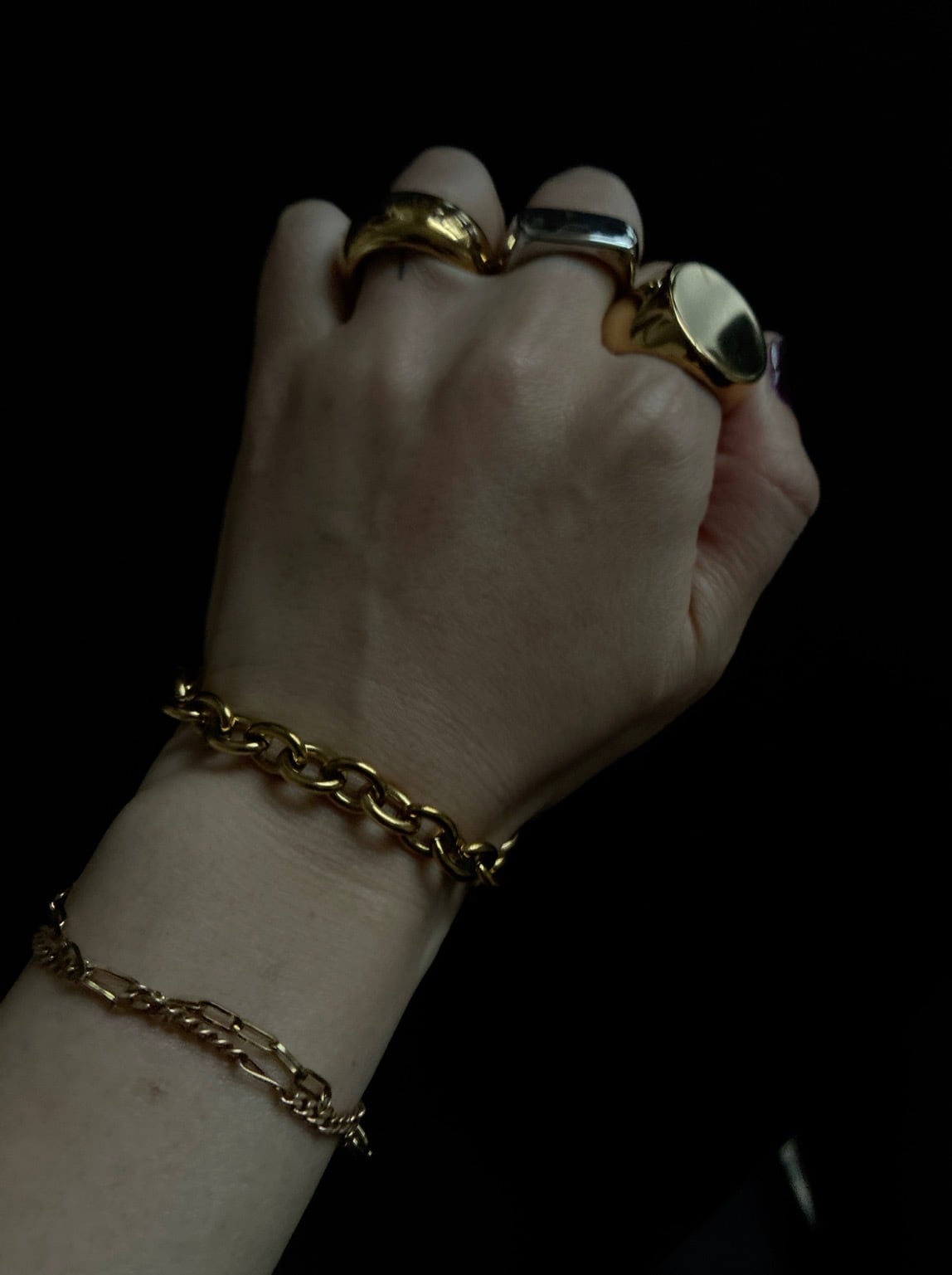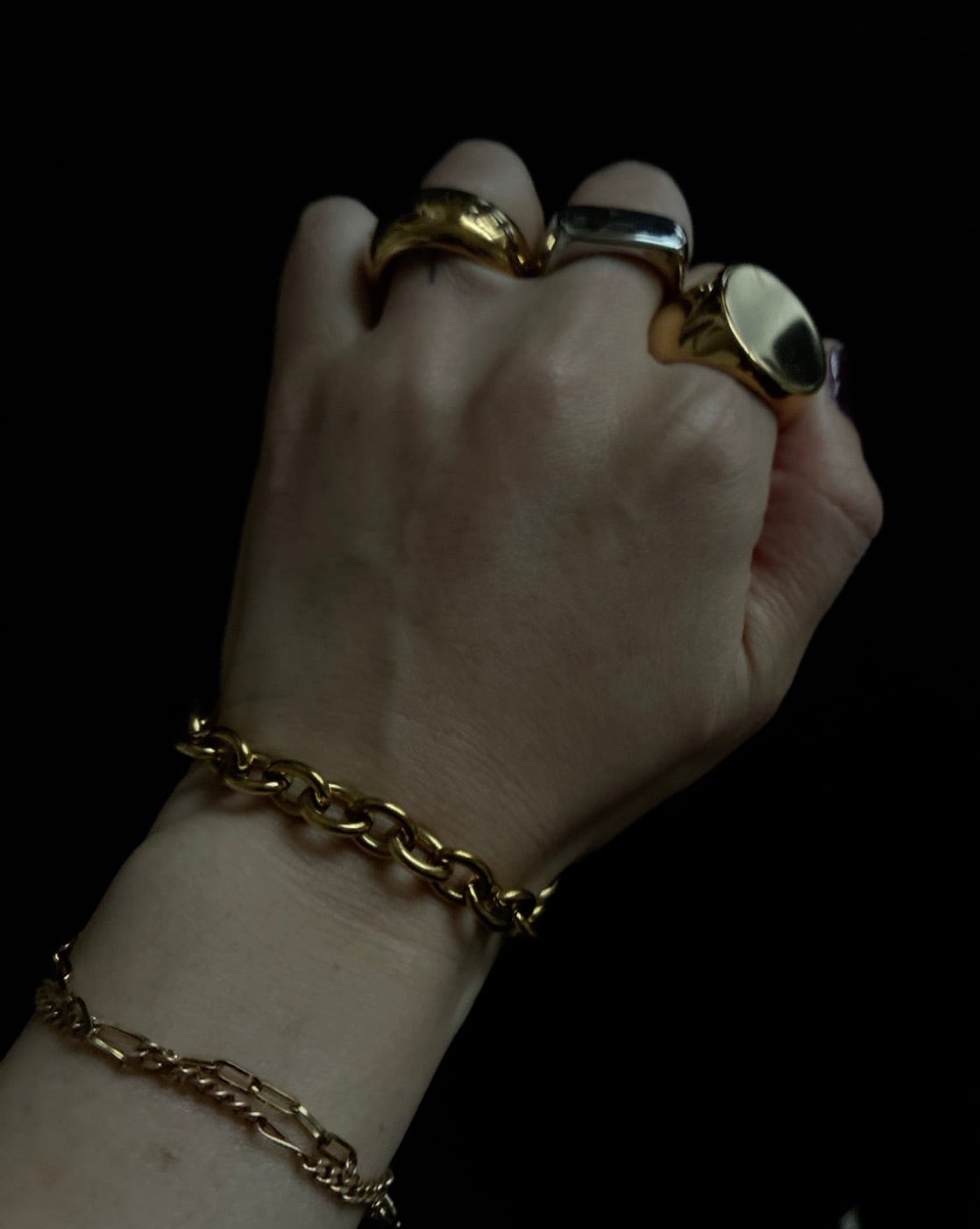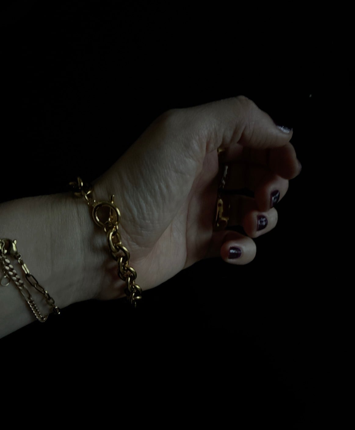 ✴︎ゴールドの適度な存在感のあるブレスレット。ラグジュアリーな雰囲気もあり、春先の手首のポイントに。