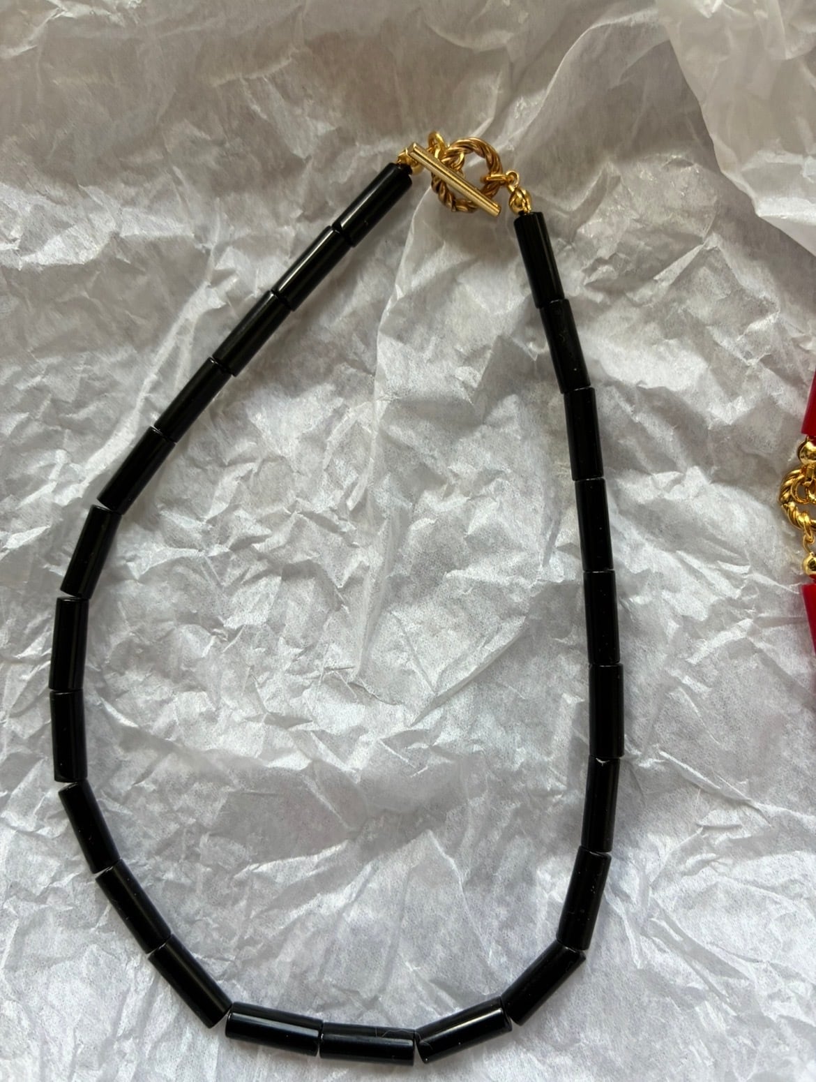 スクエアが個性的なオニキスとコーラルの2色展開。beadsはカジュアルなので、大人が外しで着けれるカラーのネックレス。