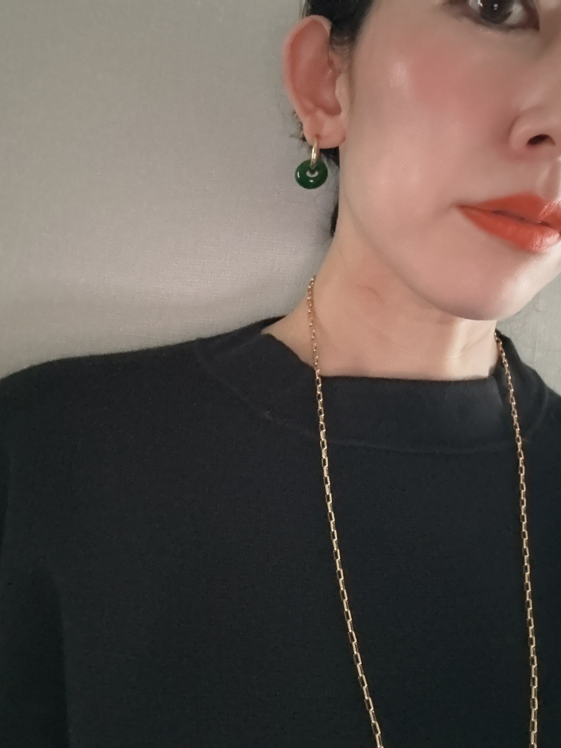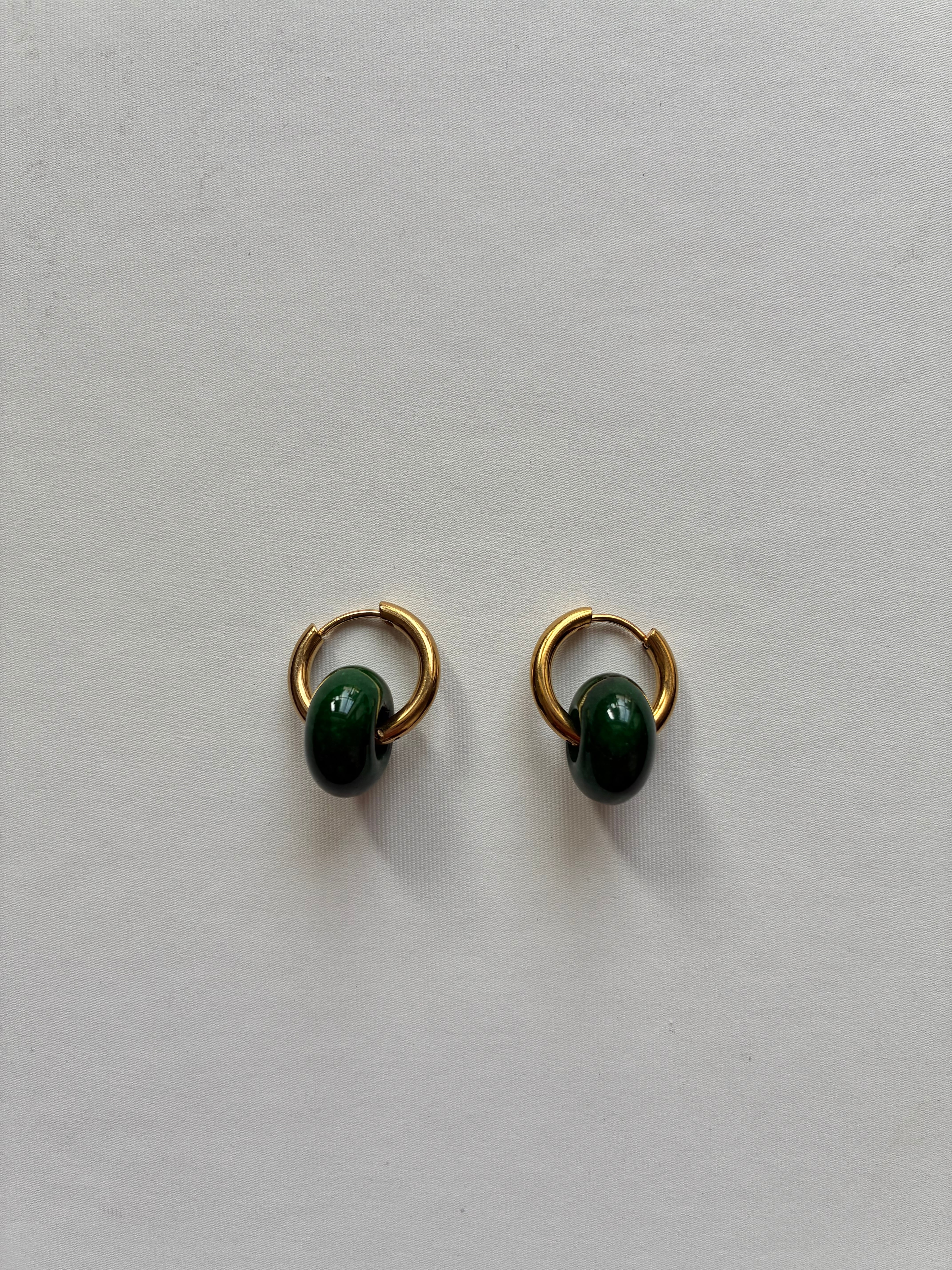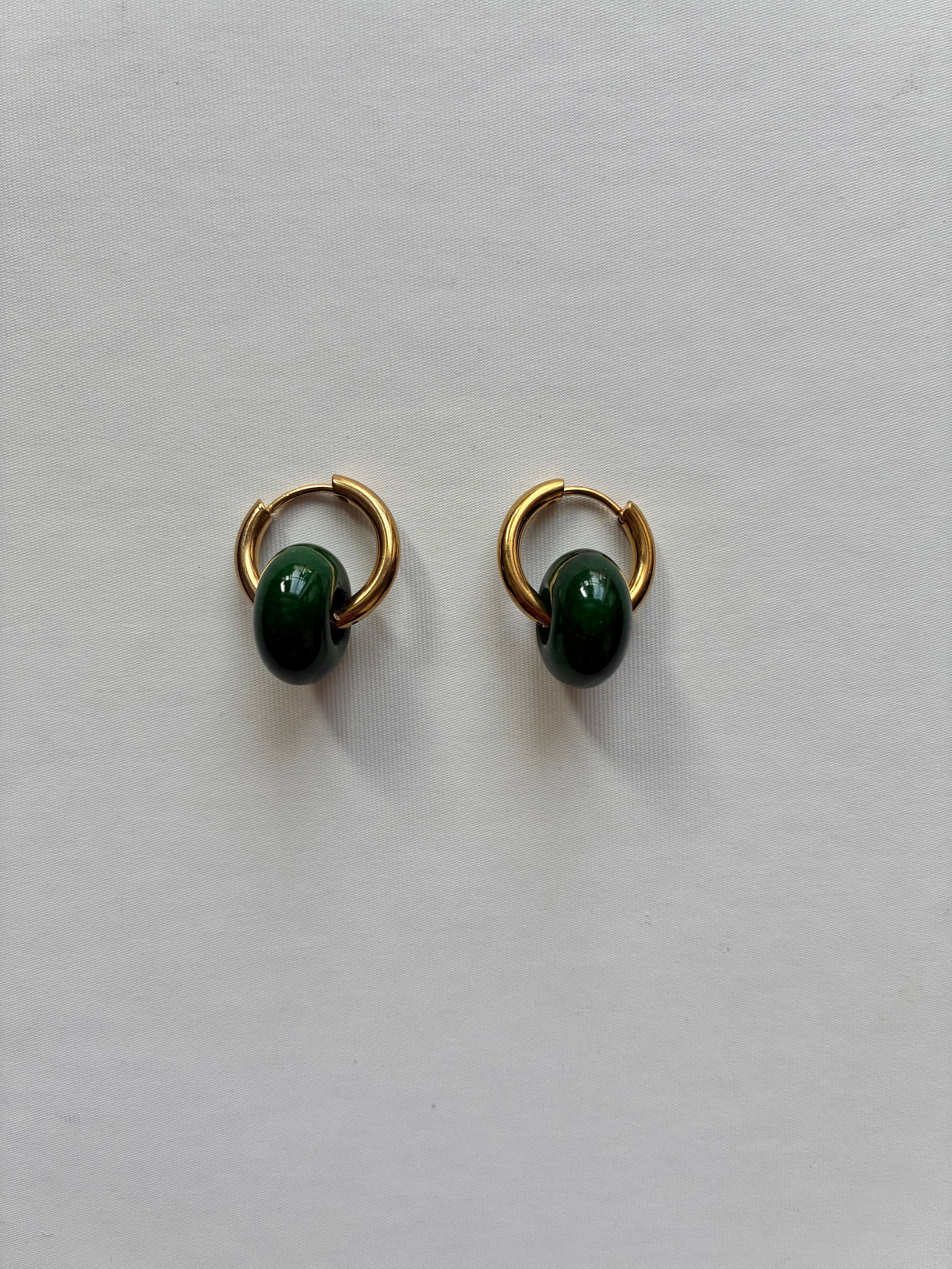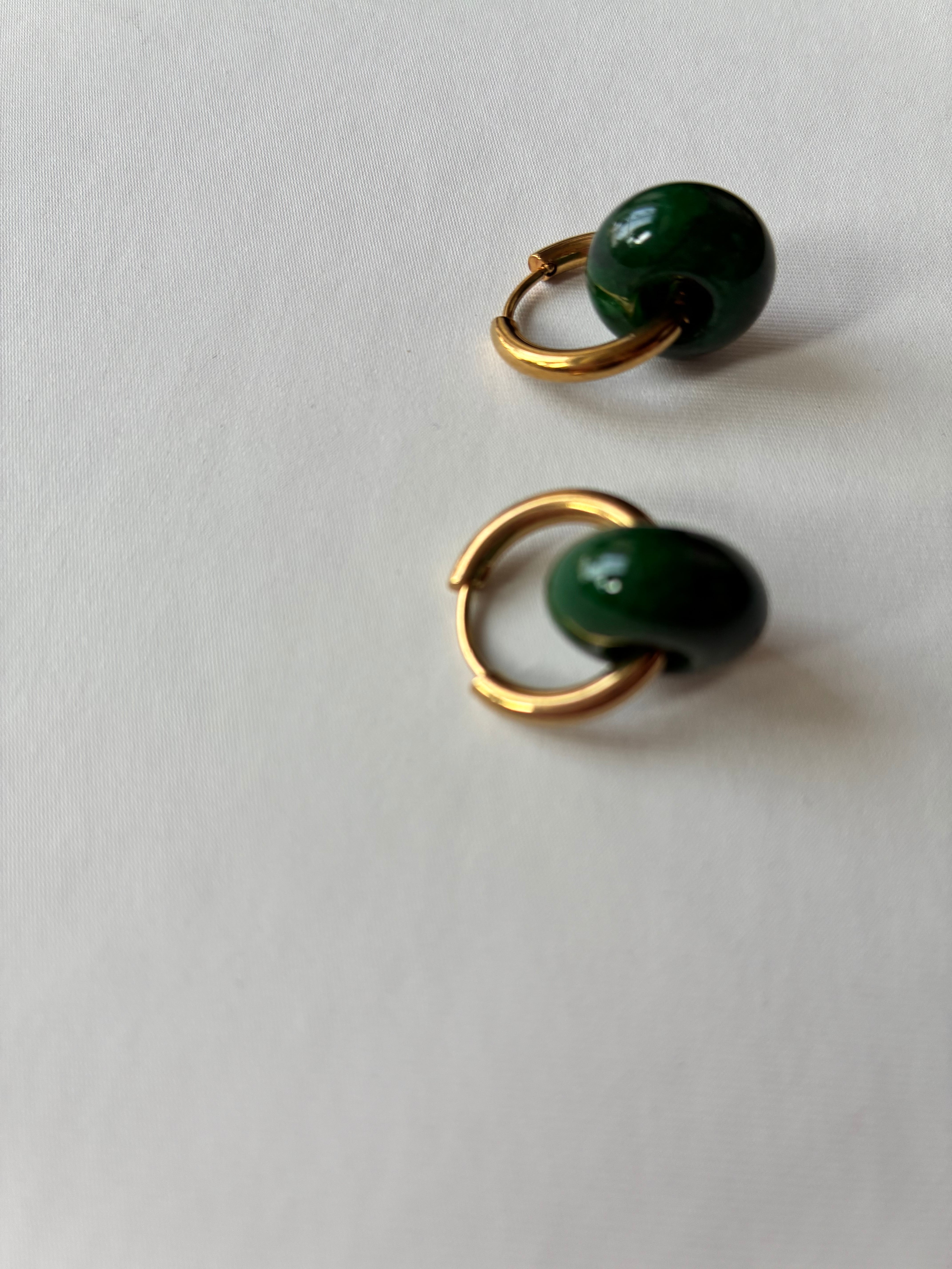 深みのあるグリーンは、耳元を引き立たせる。CALENDRIER定番ストーンイヤーアクセサリー。