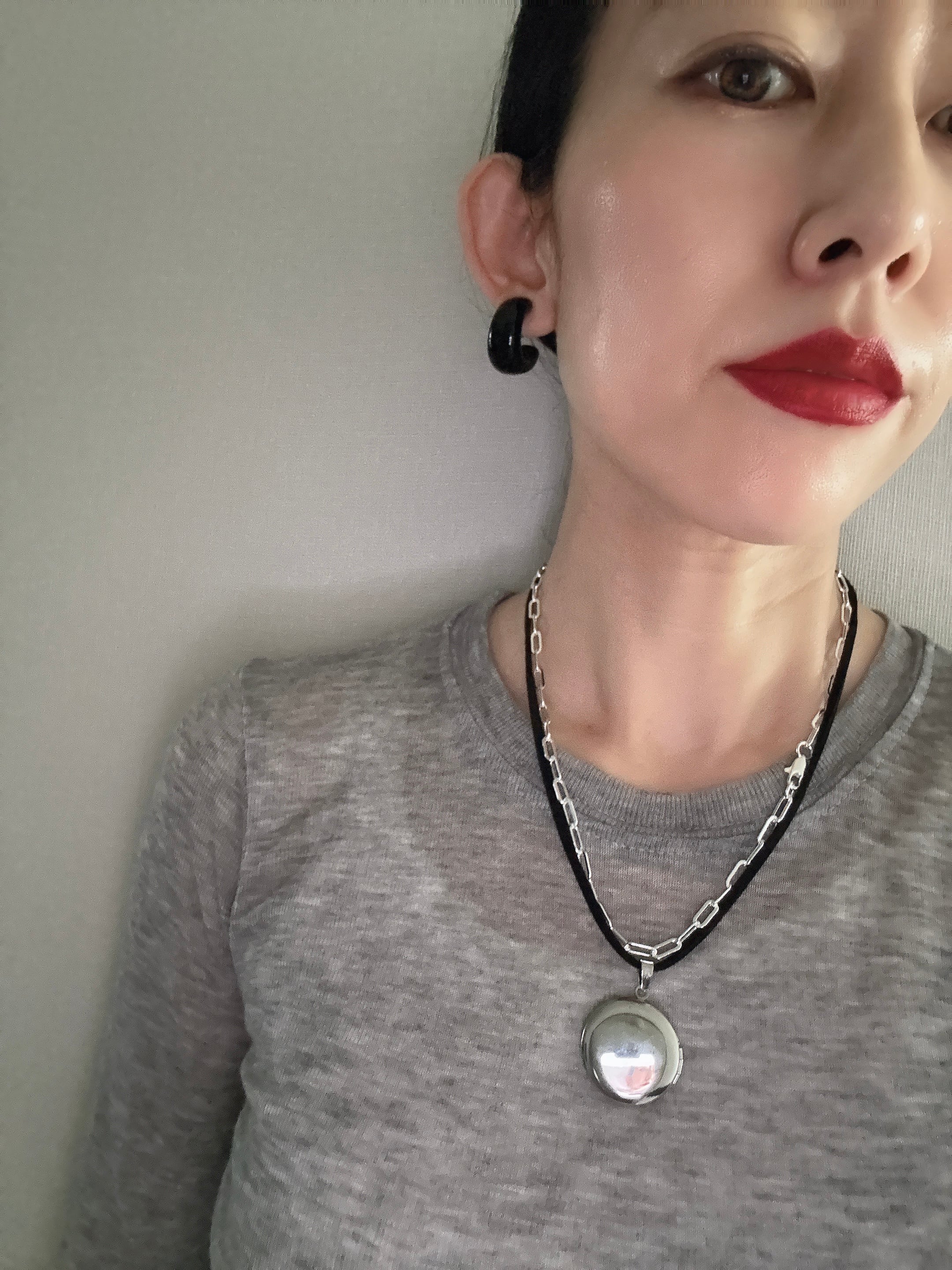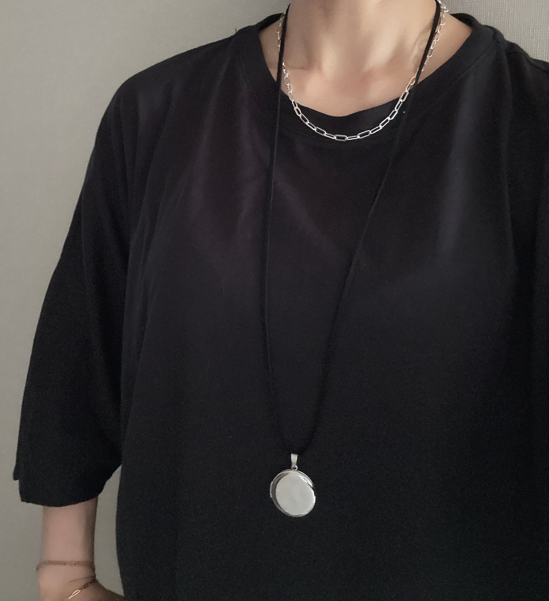 まん丸なシルバーチャームは、ブラックスエードと相性が良く、新鮮なアイテム。お手持ちのシルバーネックレスと組み合わせて、チョーカーとsetにできるようにしているので、それも楽しんで欲しいです。