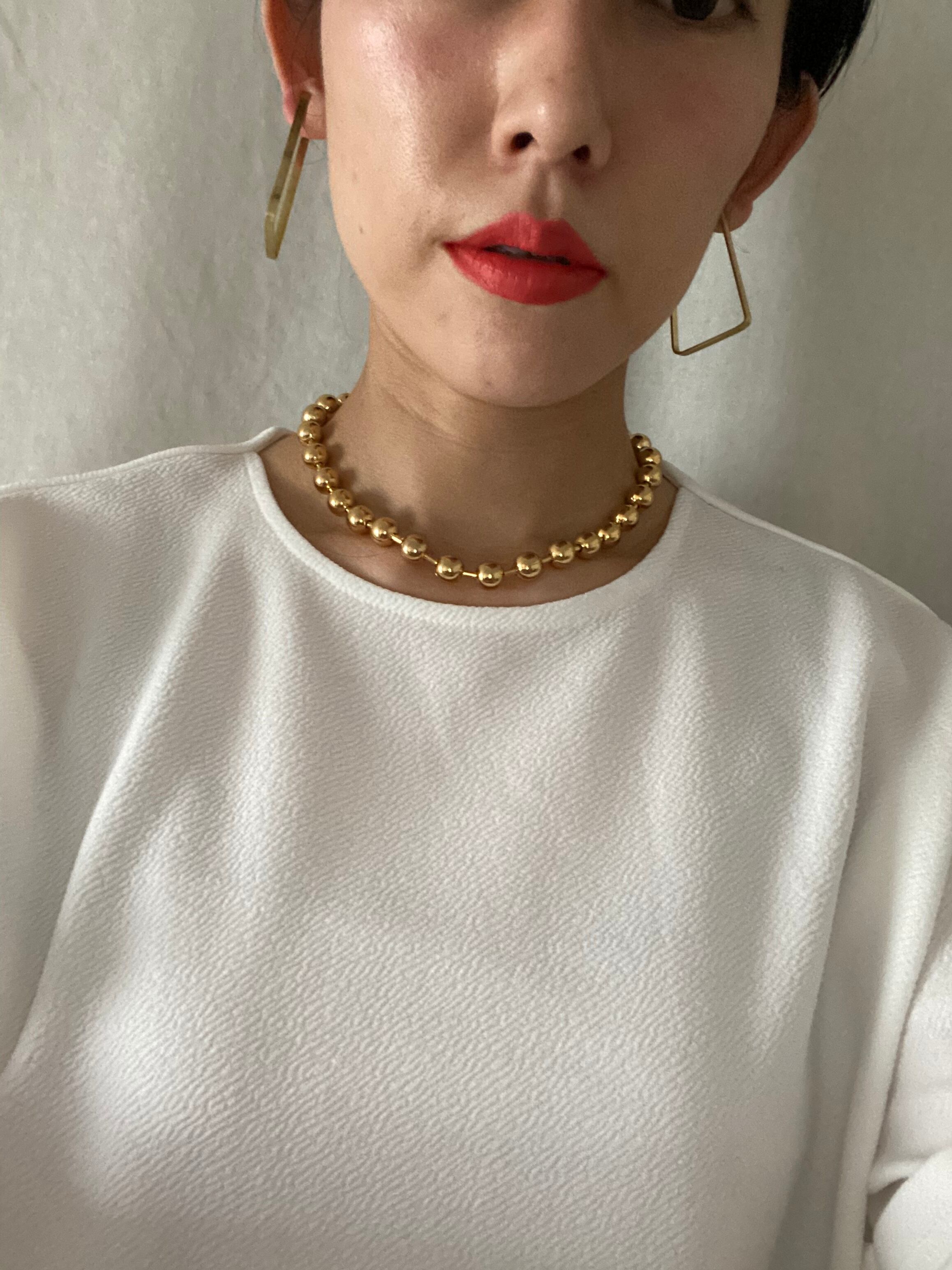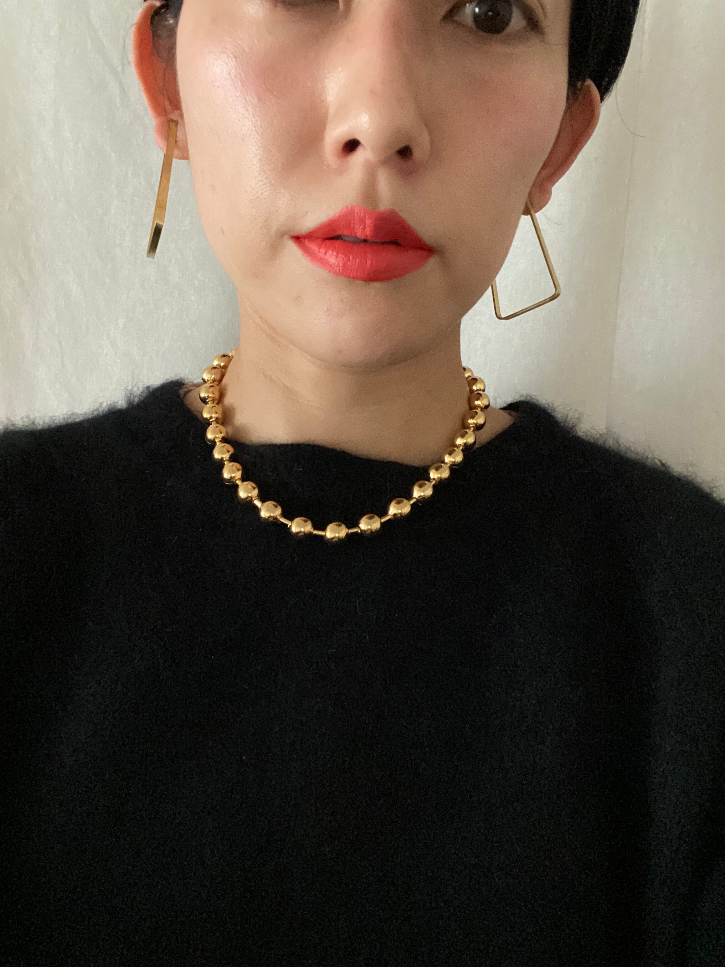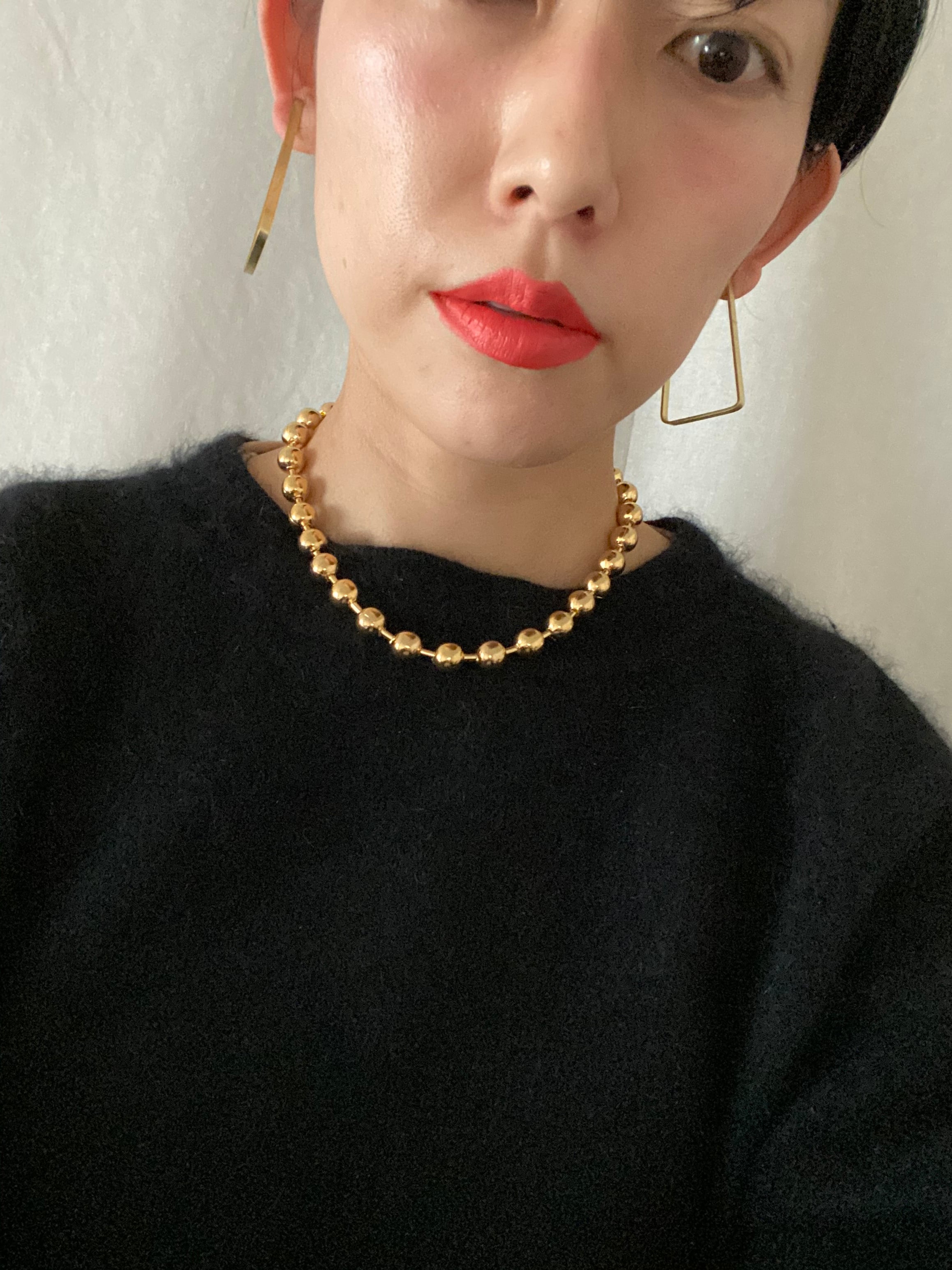 一粒1㎝。コネクター部分は、ステンレス素材約3㎝。軽め。ありそうでないGoldのボールチェーン。大粒のボールチェーンは、重ね付けもオススメです。