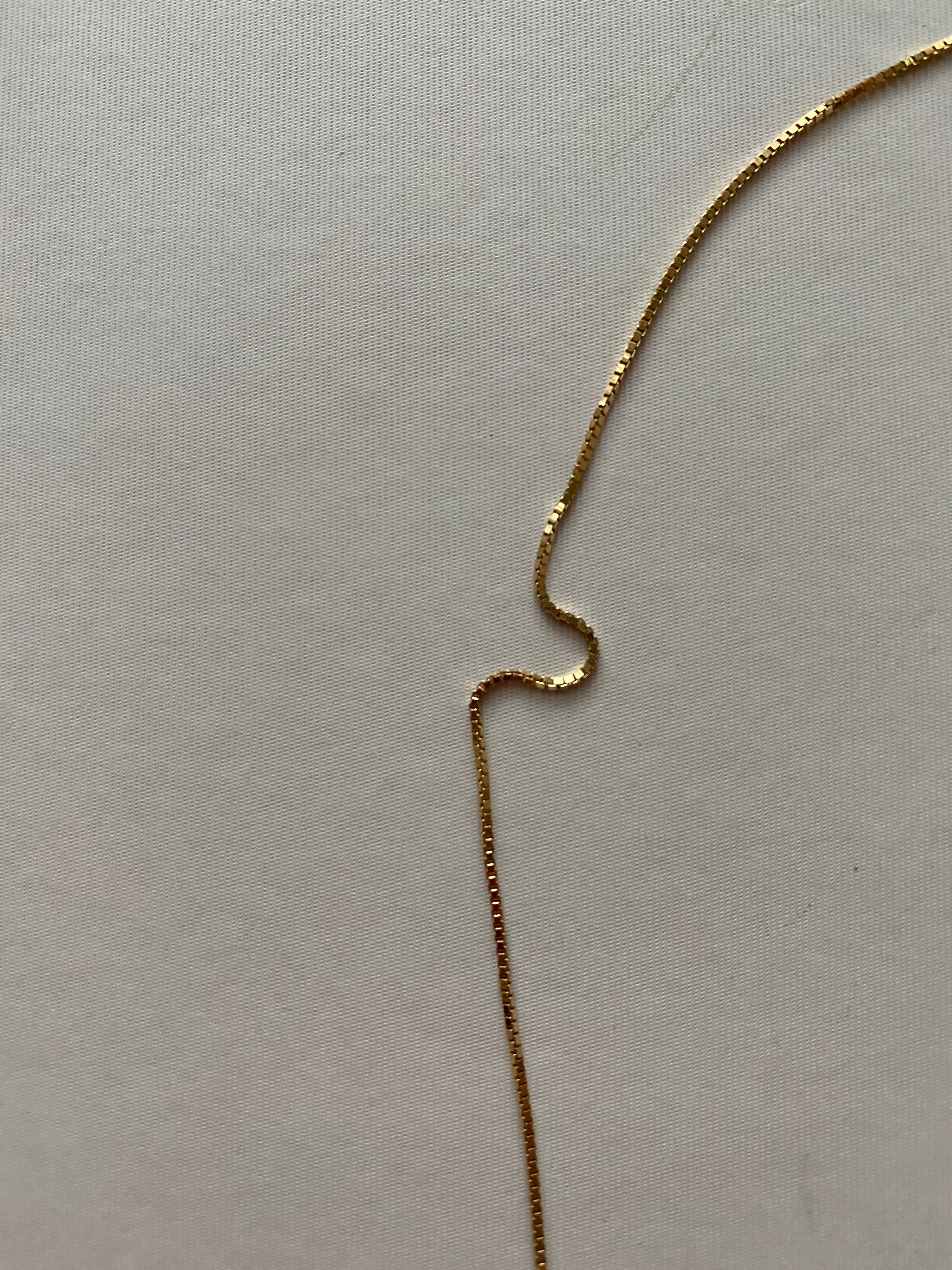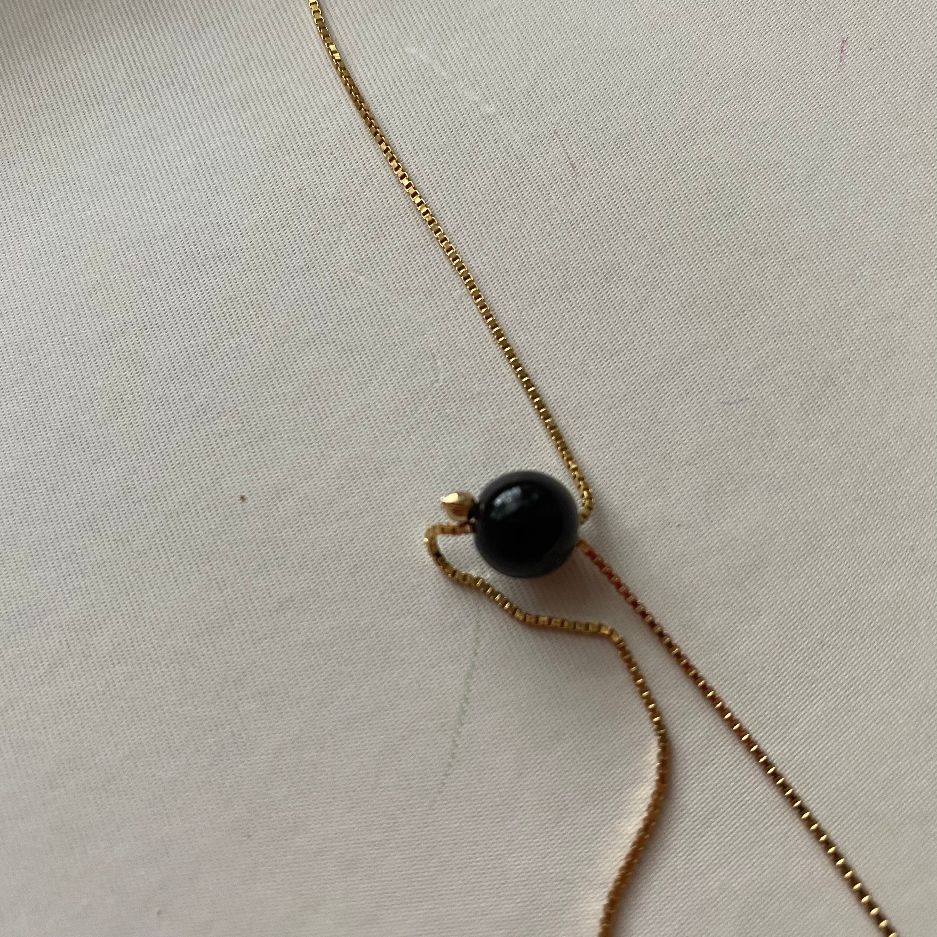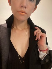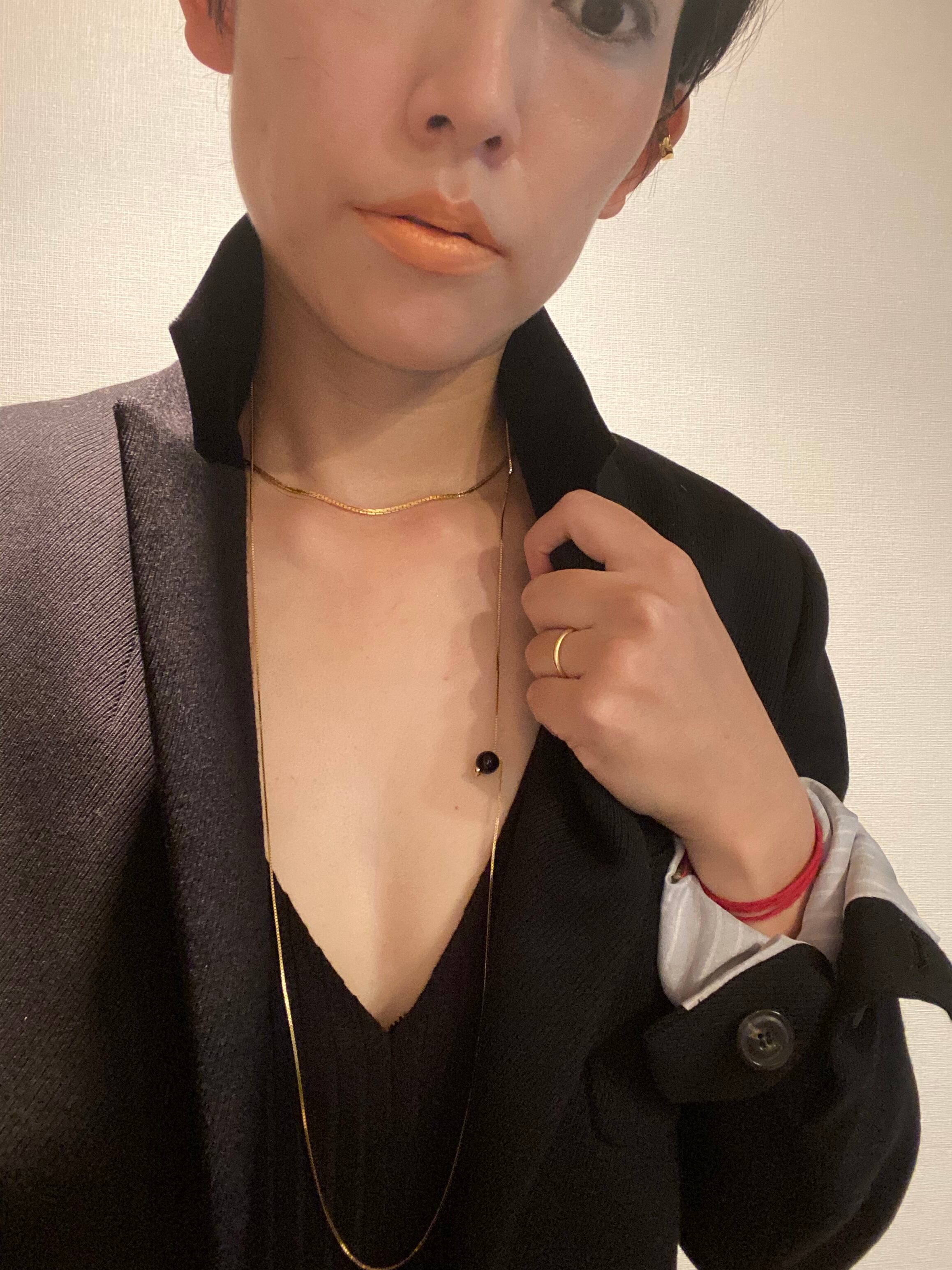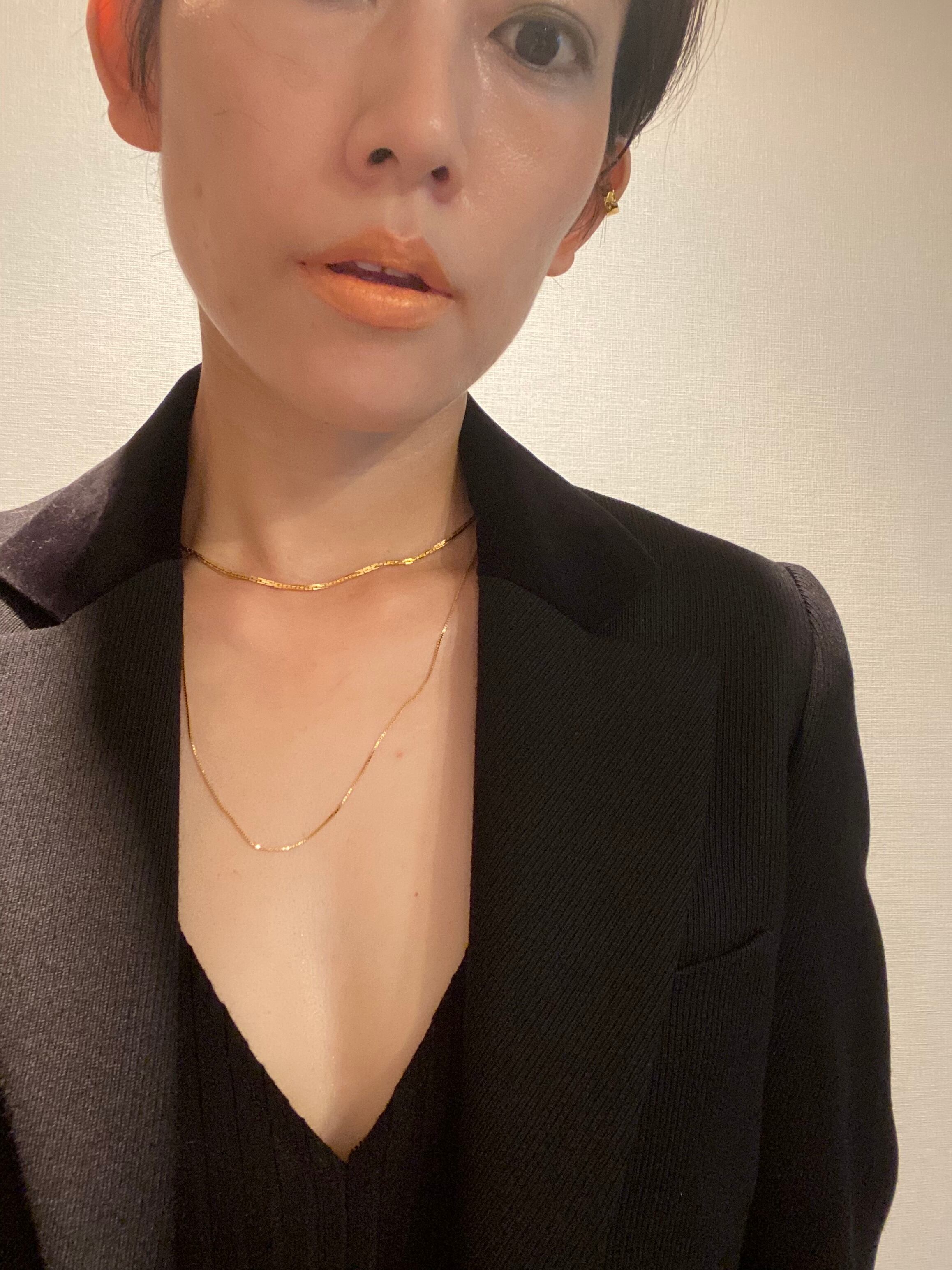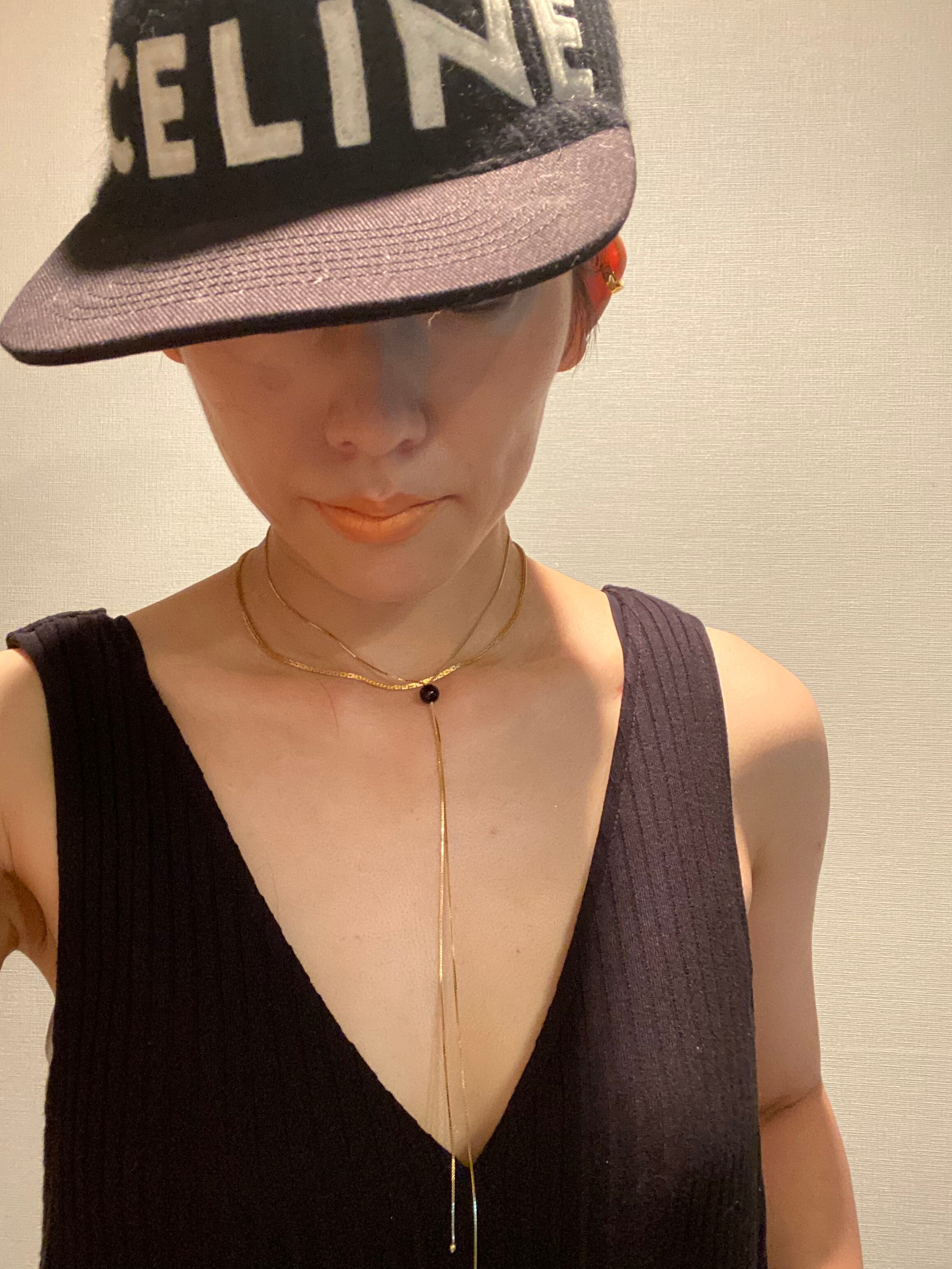 長さが自由な変えれて、バックにチェーンを落としたり、チョーカーの様にしたりとアレンジはさまざま。ゴールド。