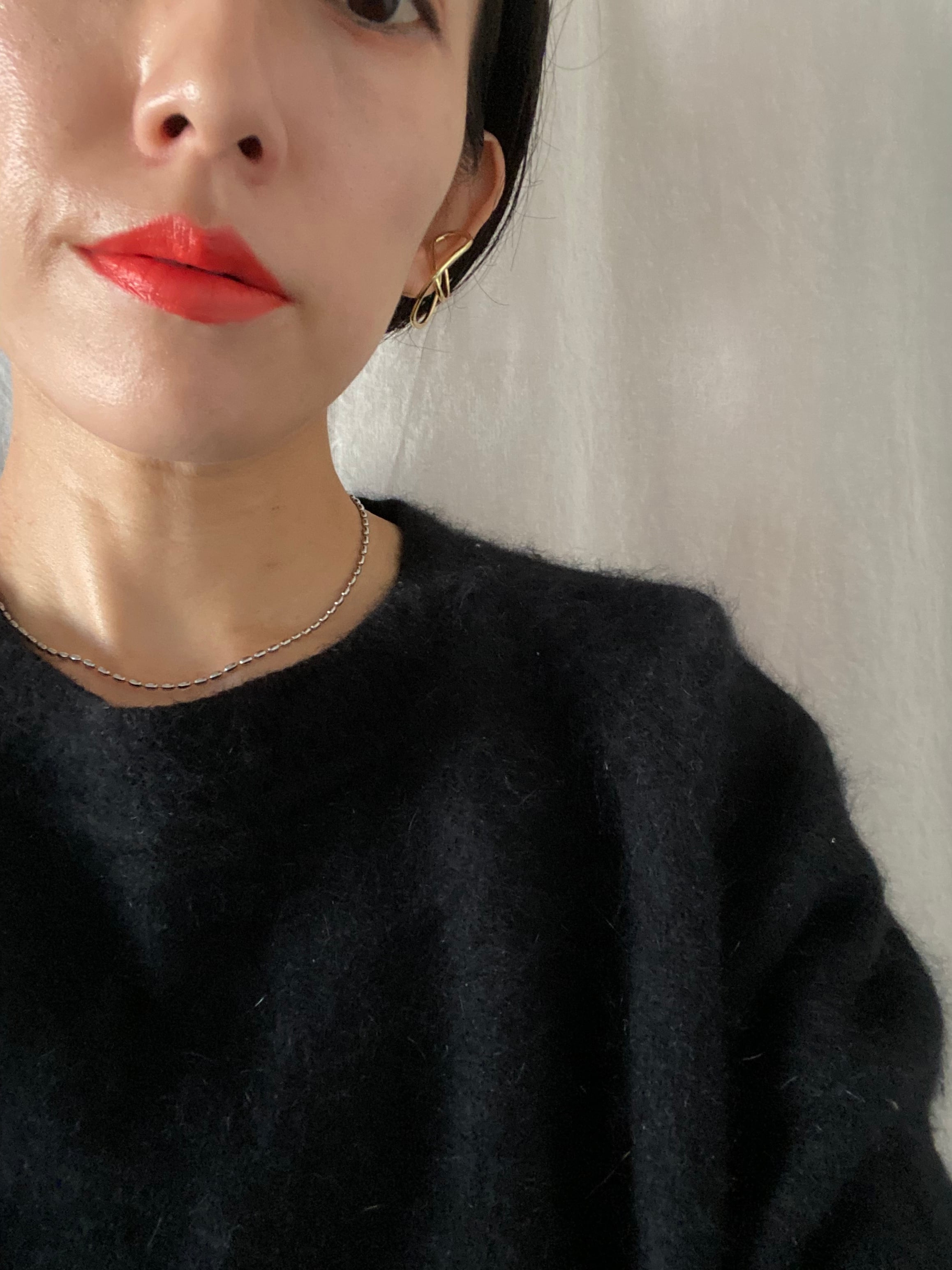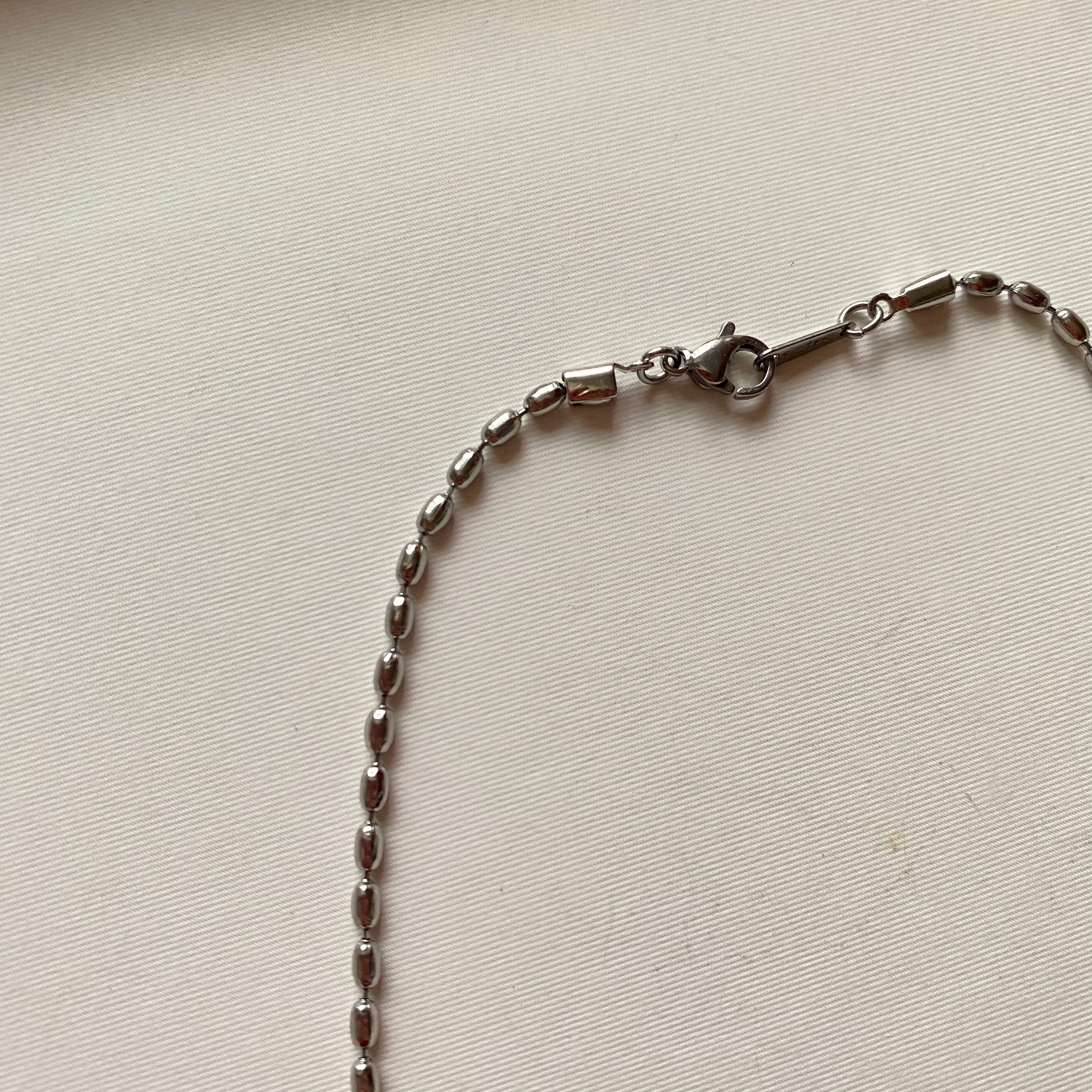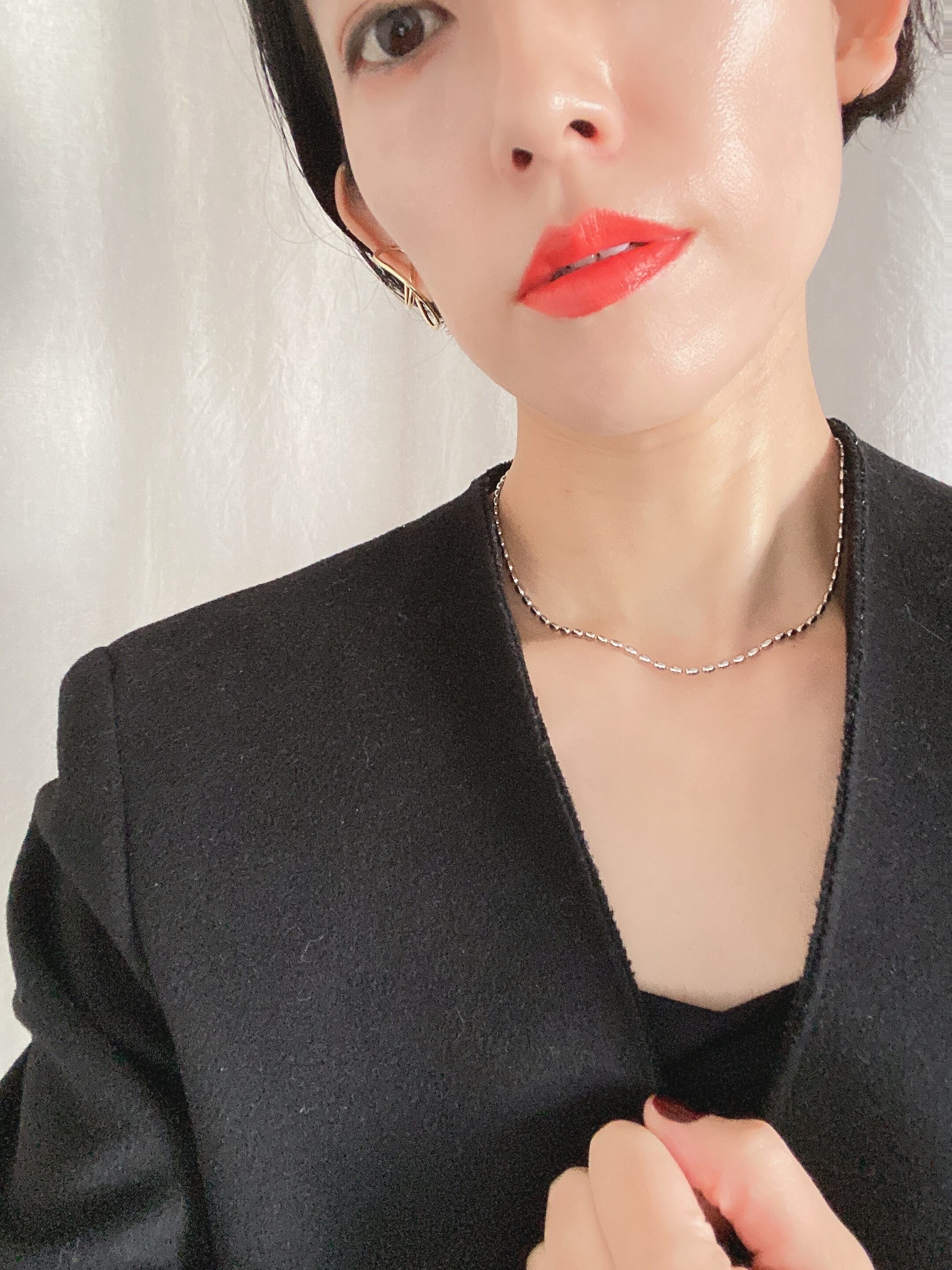 クルーネックにもさり気なくポイントになるオバールネックレス。重ね付けもおススメ。