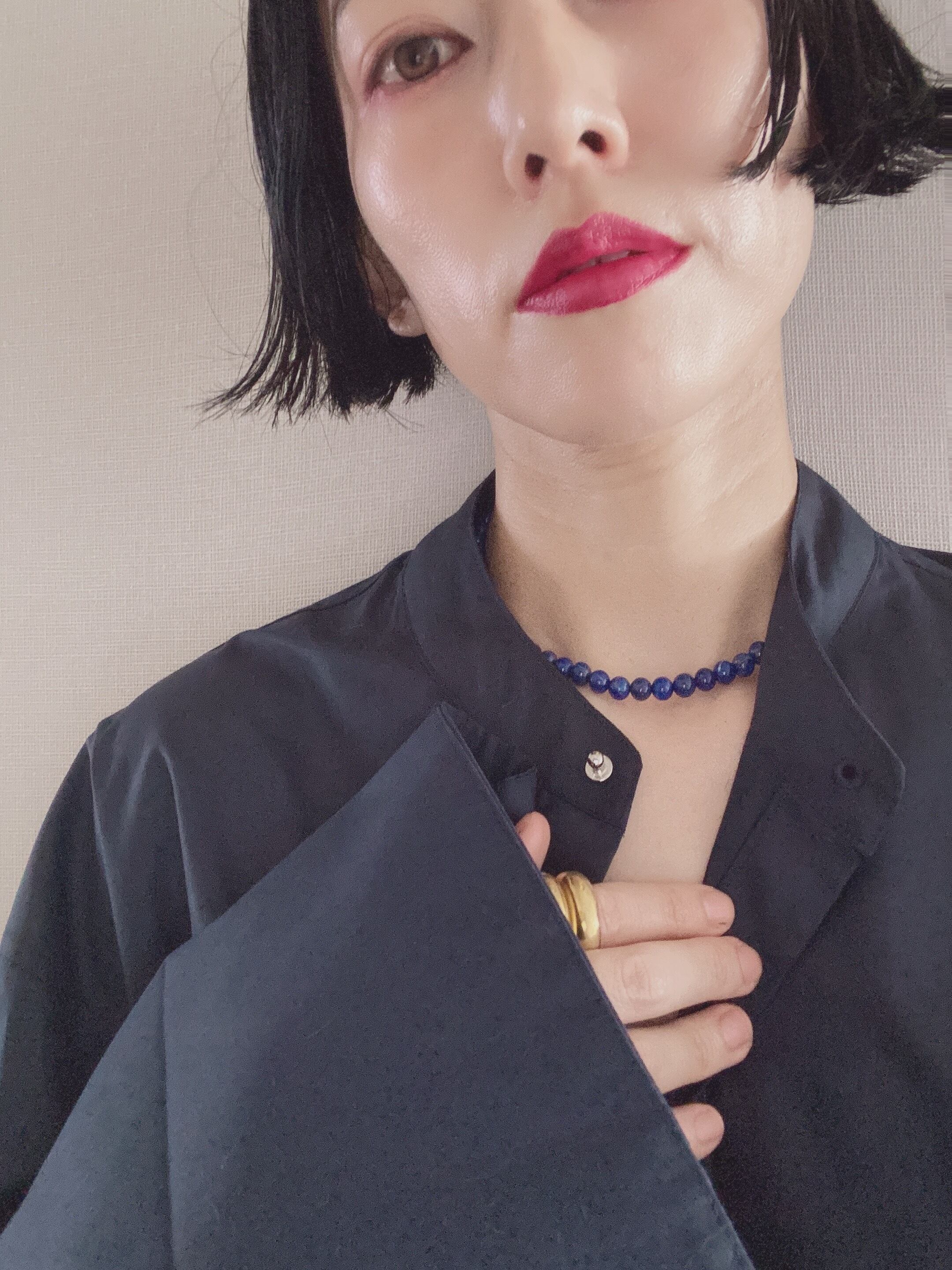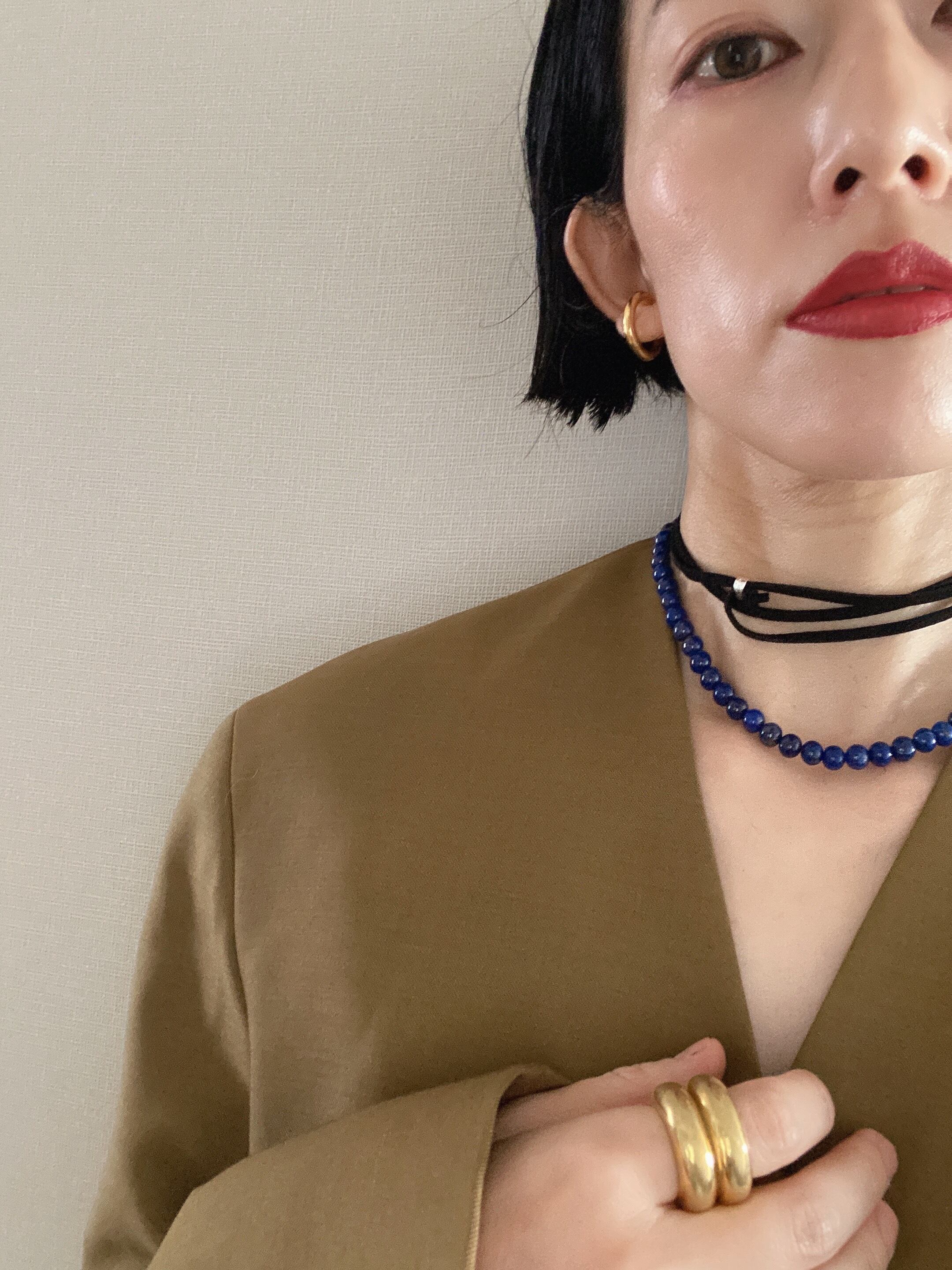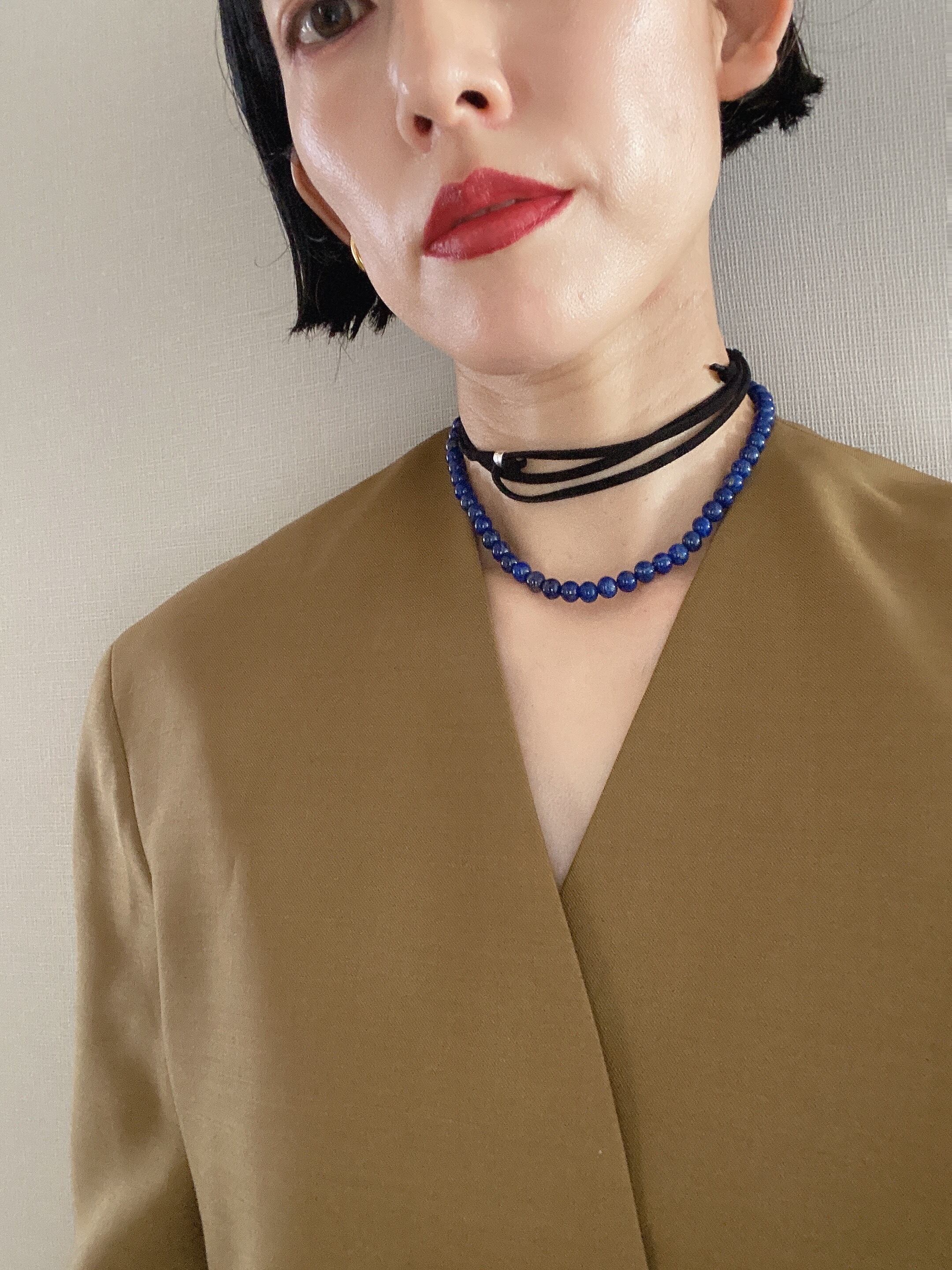 ブルーが綺麗なラピスは、ゴールドやシルバーのネックレスとの重ね付けはもちろん、これ一つで首元を華やかにするアイテム。